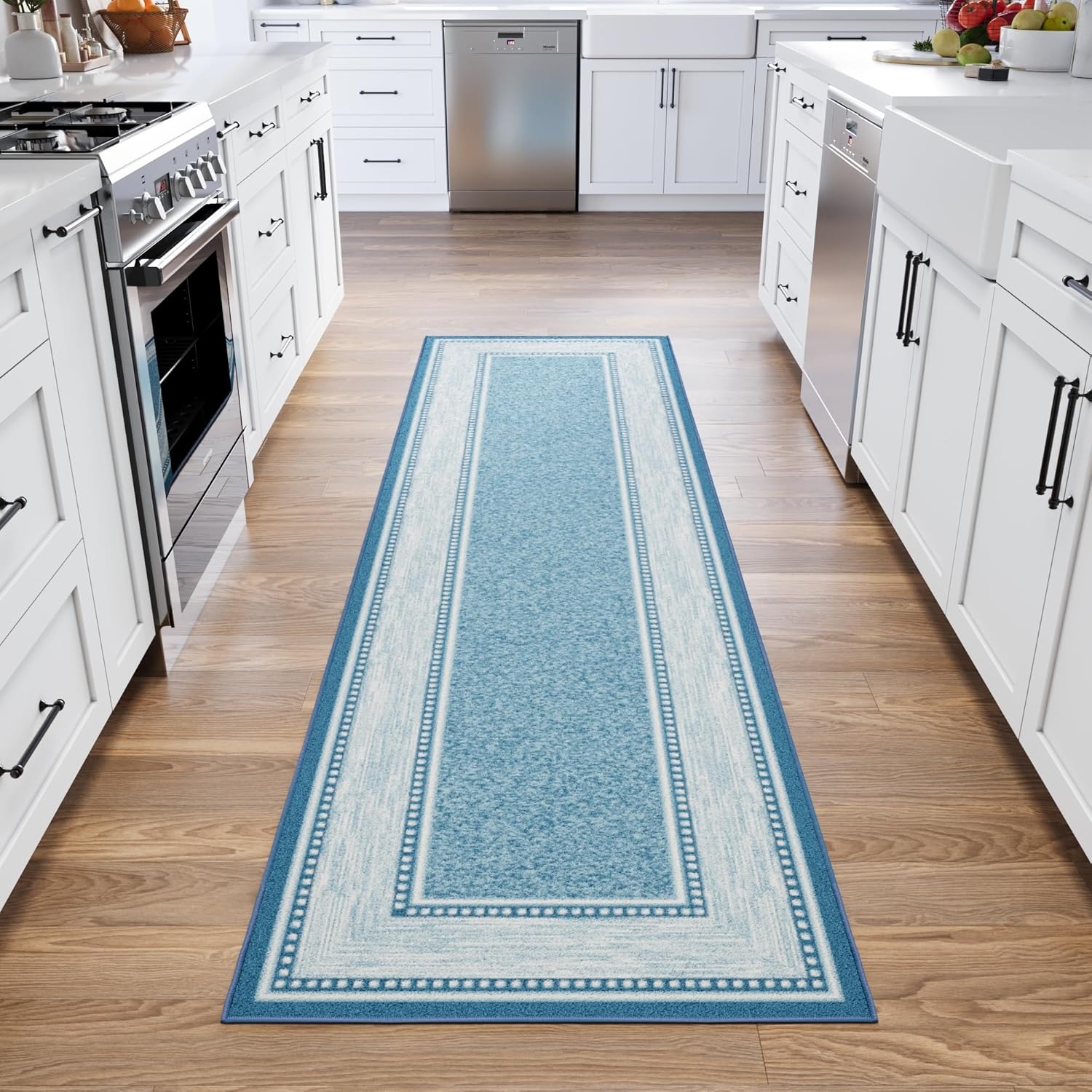 The Ottomanson Border Indoor Rug Collection is designed for homes that need practical rugs for everyday living spaces. With a classic framed border pattern, a low-profile surface, and a non-slip rubber backing, these rugs provide both style and functionality for areas that experience regular foot traffic.Looking for a runner rug for a hallway?Many customers choose the runner sizes in this collection for hallways, corridors, and narrow walkways where a long rug helps protect flooring while adding a finished decorative look.Need a kitchen runner rug for in front of the sink?Runner rugs in this collection are often placed along kitchen counters, in front of sinks, or between kitchen islands and cabinets where people frequently stand while cooking or washing dishes.Searching for a small entryway rug or indoor door mat?Smaller rug sizes work well inside front doors, mudrooms, and apartment entryways, helping catch dirt from shoes while keeping indoor flooring cleaner.Can this rug be used in living rooms or bedrooms?Yes. The area rug sizes in the collection can be used in living rooms, bedrooms, offices, or seating areas where a compact rug adds comfort and floor coverage.Will this rug work on hardwood or tile floors?Each rug includes a non slip rubber backing designed to help the rug stay in place on common flooring surfaces such as hardwood, laminate, tile, and vinyl.Is the rug thick or bulky?No. The rugs feature a low pile construction, allowing them to fit easily under doors and furniture while helping reduce tripping hazards in busy areas of the home.How do you clean the rug?These indoor rugs are easy to maintain with regular vacuuming and occasional spot cleaning, making them suitable for households with everyday foot traffic.The 2'7" x 9'10" size is commonly used as a hallway runner rug, making it well suited for long hallways, apartment corridors, and extended entryways where additional floor coverage is needed.