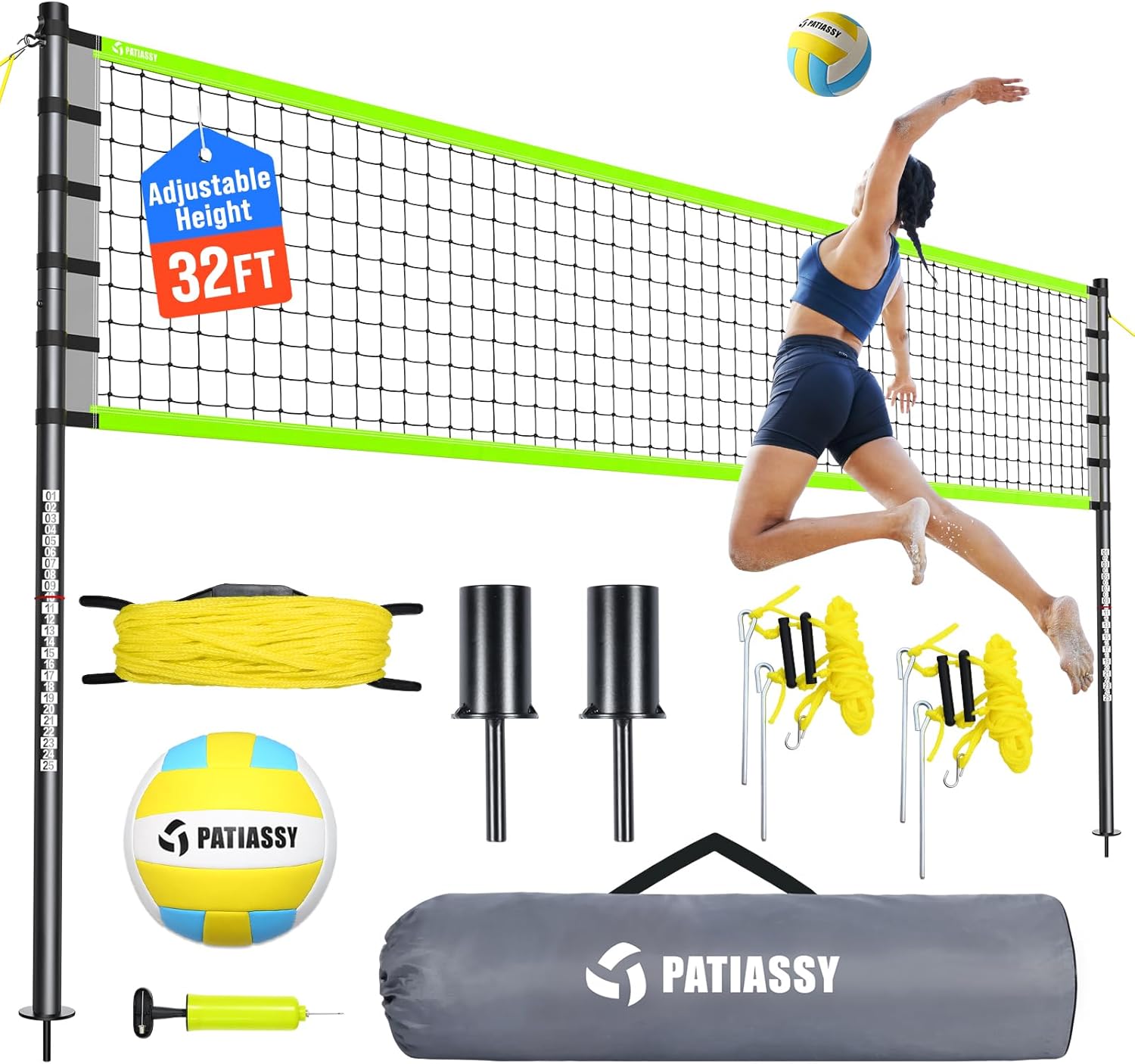 Patiassy Volleyball Net Set System with Quick & Easy Setup Adjustable Height Steel Poles, PU Volleyball with Pump and Carrying Bag for Beach, Backyard and Grass Regulation Size Volleyball Net (32'L x 3'H): The 24-ply PE net (not 18-ply like others) is strong and tear-resistant to withstand the high impact of the volleyball shots while playing. The beach volleyball net is reinforced with 3-inch side tapes and 1.5-inch top & bottom net tape for shape retention after repeated use and the durable 12 side straps can help to keep the net stable and minimize sagging. High Quality Volleyball: This 8.5" machine-stitched volleyball has soft touch PU cover, which lessens the impact on your arms and hands. While construction of yarn winding inside gives it extra durability for longer life. Height Adjustable volleyball net with Poles: The black powder-coated poles are sturdy enough to offer maximum stability to the net. Push-button locking system allows for quick setup and Eye Bolt system makes it easier to adjust the net to 3 different heights for men's (8'), women's (7'4'') and co-ed (7'8'') playing heights. Ease of Use: This outdoor volleyball net set comes with a durable 600D oxford carrying bag which allows for easy storage and transportation.