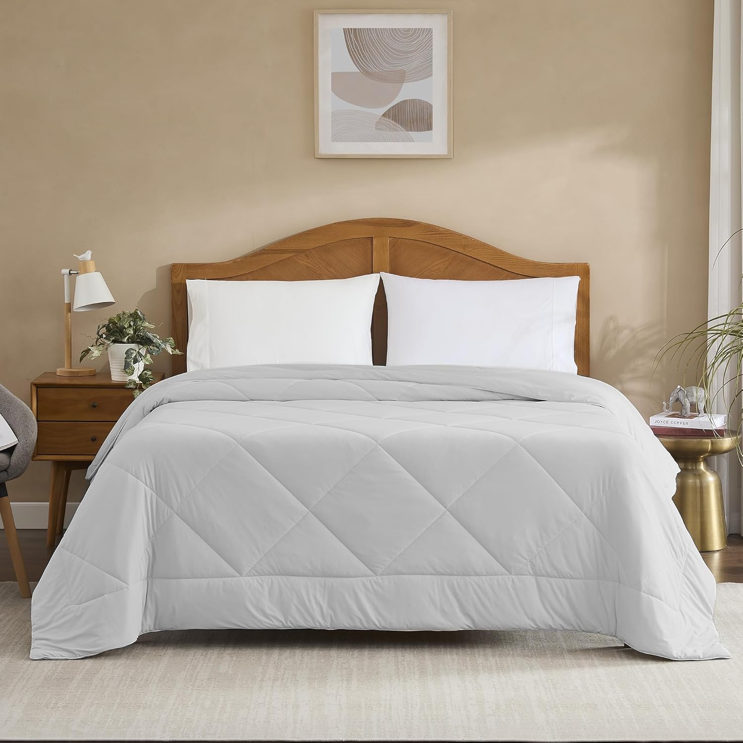 Experience cool comfort night after night with our Oversized Cooling Comforter – made to soothe hot sleepers and enhance bedroom style.This one-piece comforter is reversible, featuring the same calming color on both sides for versatility. Wrapped in a shell made of 90% nylon and 10% elastane, with 100% polyester fill. The diamond-quilted pattern ensures even distribution of fill so there are no cold spots. Finished with white binding trim that adds elegance and clean lines.📏 Dimensions by Size:Twin / Twin XL: 68″ wide × 90″ longFull / Queen: 90″ wide × 90″ longKing / California King: 106″ wide × 90″ longThis oversized design provides excellent coverage—plush drape, clean edges, generous drop on all bed types. Whether you’ve got a thick mattress or want full wrap-around comfort, the large dimensions mean no tugging or folding needed. Guests, couples, or restless sleepers will appreciate the room to breathe.Cooling Feature & Comfort: The shell—mostly nylon with elastane—delivers a smooth and stretchy feel that chills upon contact. It moves with you, preventing restriction. Inside, the polyester fiber fill is light yet warm, designed to trap less heat than down alternatives. Ideal for night sweats, hot flashes, warm weather or for those who want a lighter blanket feel without sacrificing softness.Style & Construction: Diamond quilting not only looks elegant but holds fill in place—no clumping or uneven lumps. The white binding trim outlines edges with crisp, decorative appeal. On top of that, the reversible side gives you styling flexibility—flip to refresh your bed’s look or adapt to seasonal décor changes.Perfect for:🏡 Hot sleepers wanting cooler nights👨👩👧 Guest rooms needing versatile bedding🔁 Year-round comfort for beds in warmer climates or air-conditioned spaces🎁 Gift-ready style for weddings, registrations or holidays🛋 Beds of any size—from twin through king/cali-king—looking for full drape and plush comfortCare Instructions: Machine wash cold on gentle, mild detergent. Tumble dry low or air fluff. Avoid bleach. Wash separately first few times to lock in color. With proper care this comforter maintains loft, keeps its form, color stays vibrant, trim remains crisp.Why This Comforter Wins:Reversible for twice the styling options with same color both sidesDiamond quilt evenly secures fill—no cold zonesStretch shell enhances comfort without restricting movementOversized dimensions mean better coverage and fuller bed appearanceLightweight feel with cooling properties but warm when neededStylish binding trim adds visual appeal without bulkSleep cooler, sleep smarter—this cooling comforter blends function, luxury, and style into one blanket that keeps its shape, look, and cooling comfort over time. Perfect pick for anyone who wants relief from night sweats or just a breathable cozy layer that works in every season. 🌙💤❄️