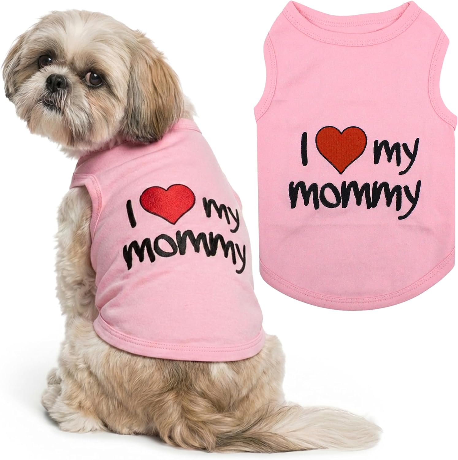 Parisian Pet Two Sweet Designs to Celebrate Your Dog’s Loving Personality — Double the Love & Cuteness Show off your pup’s special bond with mom with this Parisian Pet 2-piece dog shirt set, featuring one adorable “I Love Mommy” design and one charming “Mommy’s Boy” design. Created for proud dog moms and affectionate pups, these shirts add a heartwarming touch that makes everyday walks, cuddle time, and photo moments even more special. Designed with comfort in mind, these dog shirts are made from soft, breathable cotton that feels gentle against your pet’s skin. The sleeveless tank cut allows easy movement and improved airflow, helping your dog stay cool on warm days while remaining lightweight enough for indoor wear or layering during cooler weather. The pull-on style makes dressing quick and stress-free for both you and your pup. Built for everyday wear, these dog shirts are durable, easy to care for, and designed to maintain their shape and sweet printed designs through regular washing. Available in multiple sizes—please measure your dog before ordering to ensure the best fit. With two loving designs included in one pack, this set offers great value, versatility, and more ways to dress your pup in an adorable, love-filled style. Choose Parisian Pet for comfort, style, and undeniable charm!