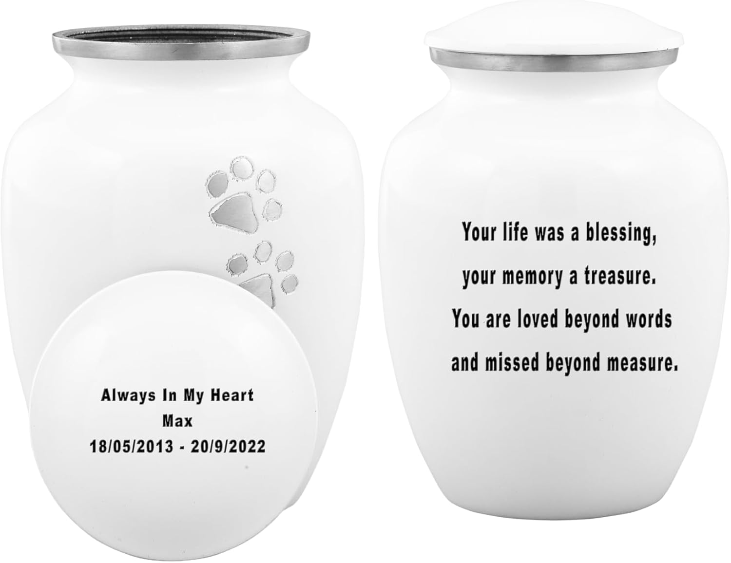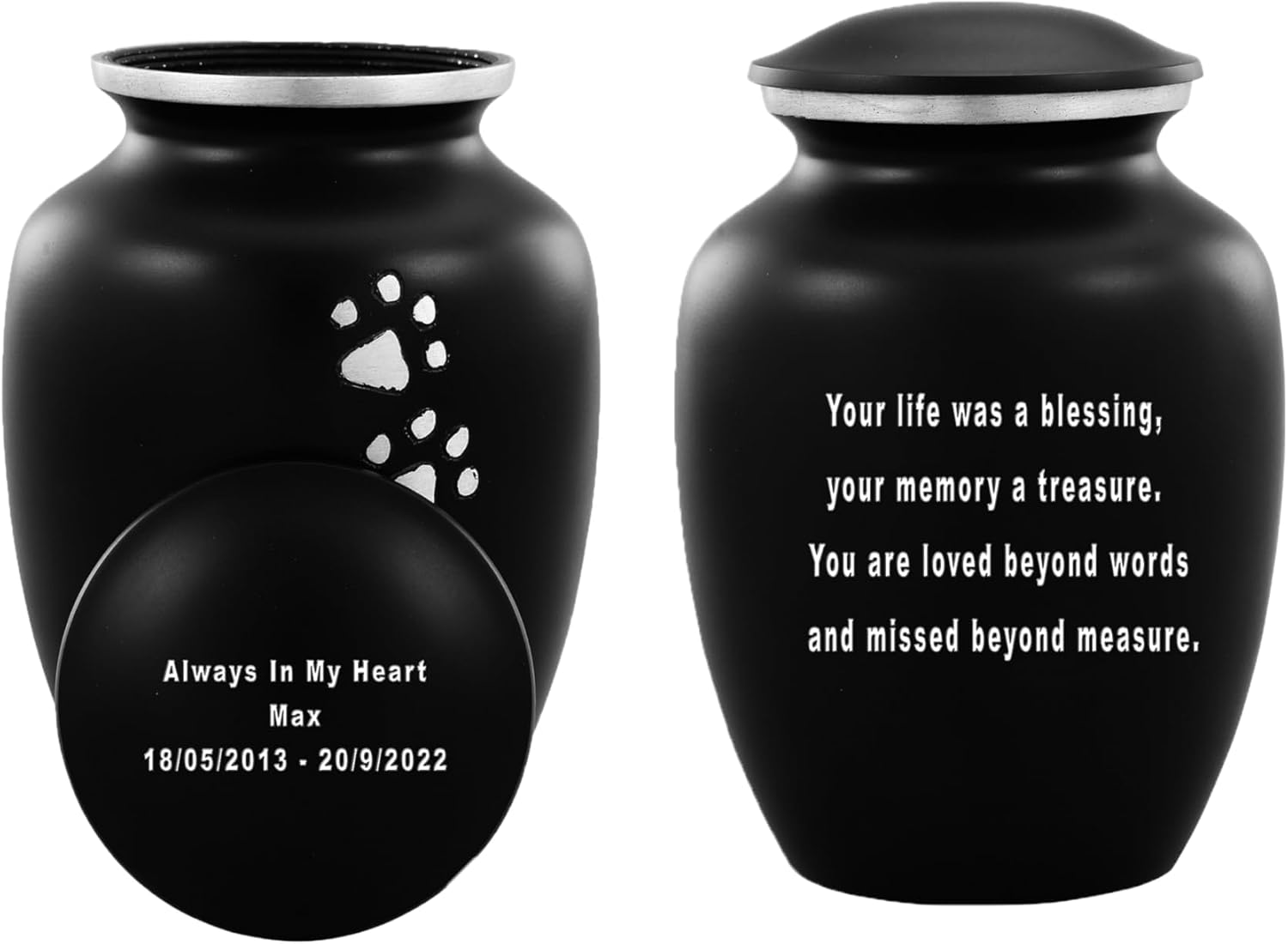 Experience unparalleled quality and dignity with our premium Urns of Dignity Pet Cremation Urn. Handcrafted with meticulous attention to detail, this stunning urn is designed to honor the memory of your beloved pet. Crafted from durable solid metal and coated with a protective enamel lacquer, this Columbarium or Home urn ensures longevity and resilience. With dimensions of 7 inches tall and 5 inches wide, it has a capacity of 85 cubic inches, accommodating the remains of a pet weighing up to 65lbs. Featuring a secure screw-bottom top, this urn provides a reliable seal to safeguard your loved one's ashes, offering peace of mind even if accidentally dropped. Each urn is meticulously handcrafted with a scratch-less enamel finish, ensuring the utmost protection and respect for your loved one's ashes. As a token of our commitment to quality, each urn comes with a complimentary velvet bag for added protection. Plus, our product is backed by a warranty, guaranteeing your complete satisfaction. If for any reason you're not entirely pleased, simply return it for a full refund. Choose our Urns of Dignity Pet Cremation Urn for a lasting tribute to your cherished companion.