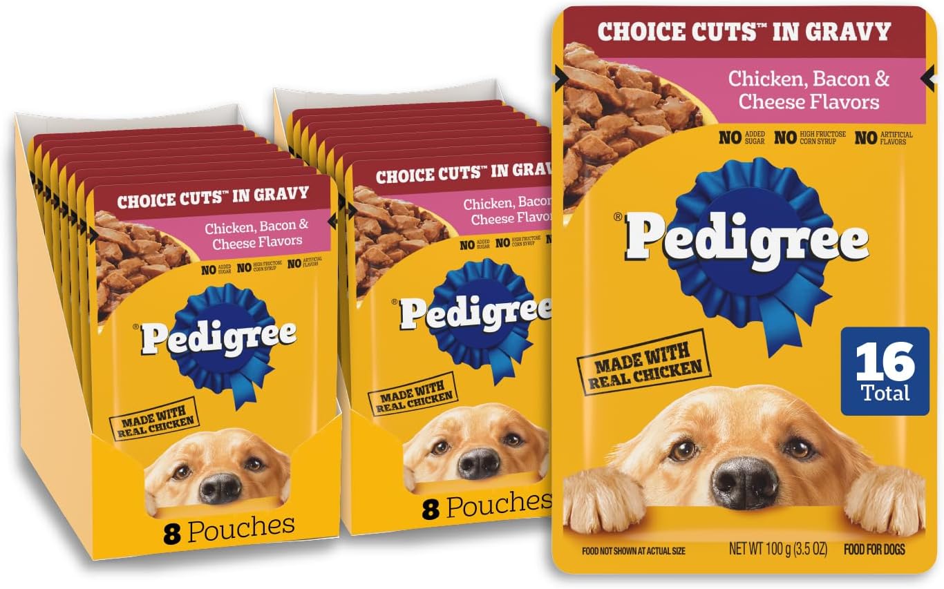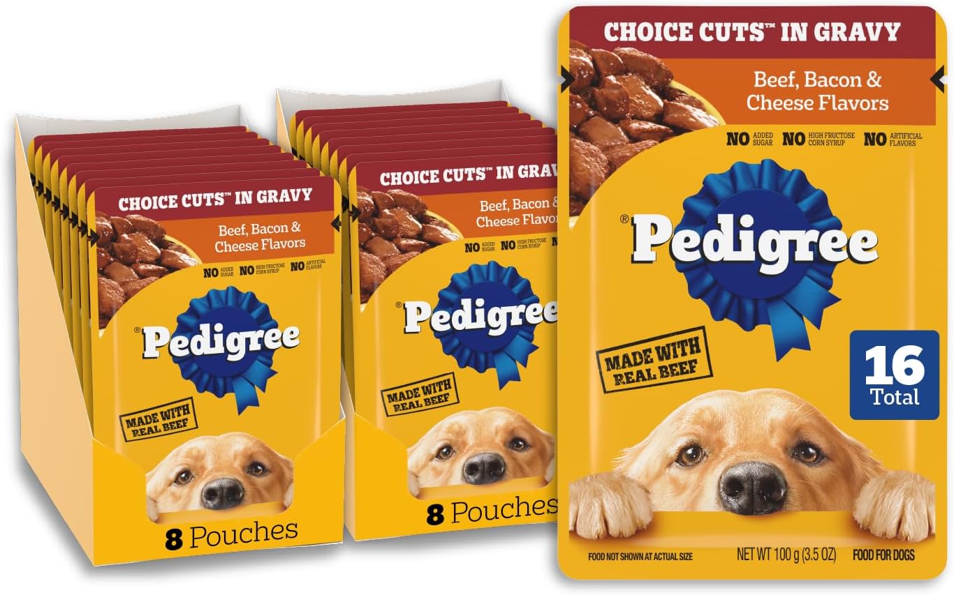 Dogs bring out the good in us. Pedigree brings out the good in them. Express your love for your dog by serving Pedigree Choice Cuts In Gravy Adult Soft Wet Dog Food. This great-tasting recipe is 100% complete and balanced for adult dogs and is steam cooked with real animal protein, delivering satisfying dog food gravy at mealtime. The formula helps support healthy skin and coat. Made with 36 vitamins, minerals, and amino acids, Pedigree Choice Cuts In Gravy supports everyday health. The versatile canned wet pet food opens easily, leaves no messy leftovers, and may be offered as dog food toppers for dry food, mixed with kibble, or enjoyed as a complete meal. The recipe is crafted to support healthy digestion and contains 0% added sugar, artificial flavor, and high fructose corn syrup. The Pedigree brand has been supporting dog adoptions for 15 plus years and helping pet parents nourish their companions with quality nutrition. Pedigree Choice Cuts In Gravy Adult Soft Wet Dog Food Filet Mignon Flavor shows your dog that you care and have great taste.