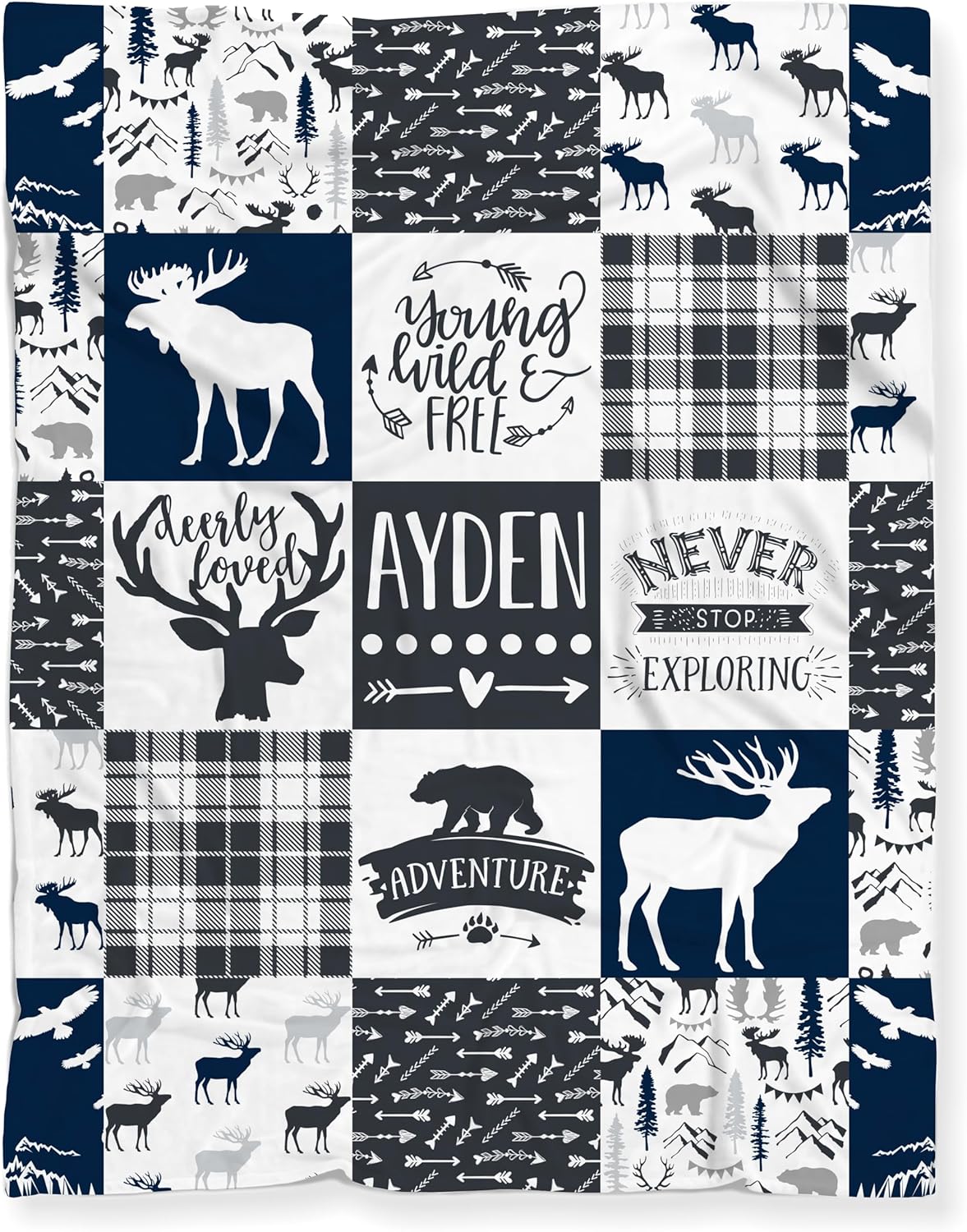 Embrace the spirit of adventure and the great outdoors with this captivating throw blanket. Adorned with a patchwork of woodland motifs, including deer, elk, moose, bears, and forest trees, this cozy blanket transports you to the heart of nature. The bold plaids and earthy hues create a rustic ambiance, while the whimsical patterns and phrases like "Never Stop Exploring" and "Born Wild & Free" evoke a sense of wanderlust. Personalized with your baby's name, this blanket adds a touch of warmth and personality to any living space. Crafted with care, it promises snug comfort as you curl up by the fire or embark on your next camping trip. Embrace the call of the wild and let this blanket be your companion on life's adventures.