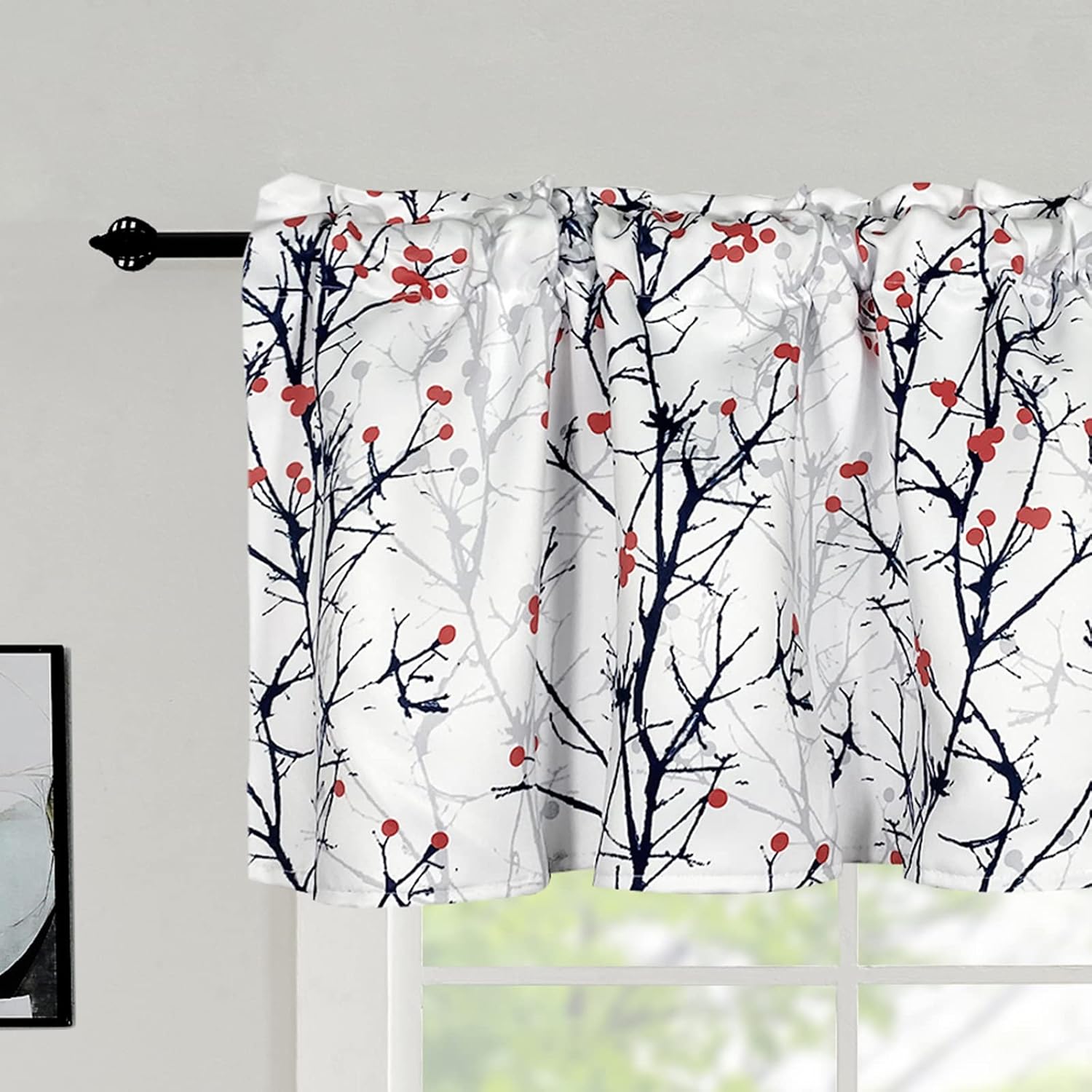 poefun Room Darkening Printed Window Valance Curtains PACKAGE: Set of 2 panels curtain valance per packSIZE: 18 inches Long, 52 inches wideCOLOR: grey, blackPATTERN: Tree Branch red fruit printedWIDE APPLICATIONS: Suitable for both indoor and outdoor, including kitchen, bedroom, living room, bathroom, basement, dining room, kids room, cafe, farmhouse, door head, nursery, laundry room, studio, office, study, sunroom, sliding glass doors, beach house, etc. includEASY CARE: Throw it into the washing machine and take it out as good as new