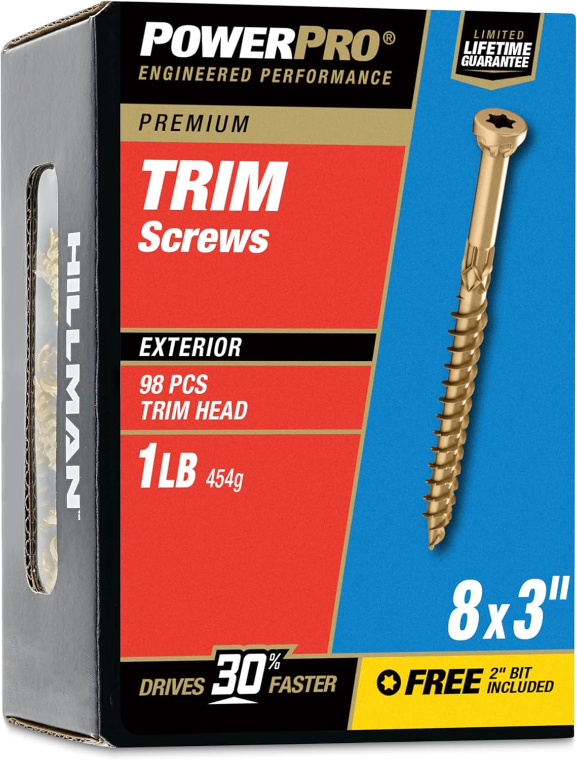 | Included Components | Power Pro 48633 Trim Screws, #8 x 3", All Purpose Wood, Deck, Composite, and Exterior Trim Screws, Rust Resistant, Bronze, 1lb Box, 108 pcs |
