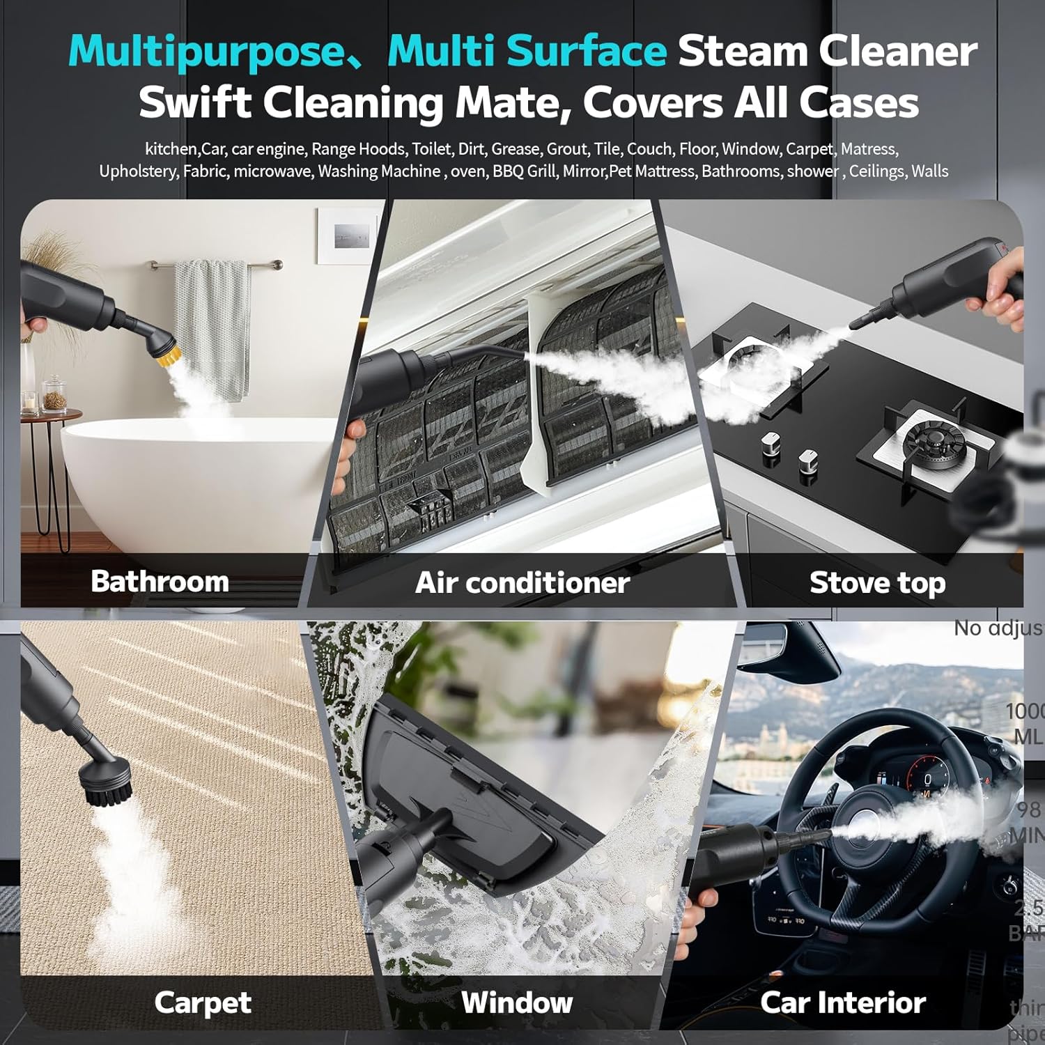 | Included Components | 1x59-inch hose , 1x59-inch cord, 1xSteam Machine With Tank,1xExtension Nozzle, 1xHigh-Pressure Nozzle, 2xNylon Brushhead,2xScraper, 1xUser Manual,1xClearing needle, 1xFloor Cleaning Brush, 1xCleaning Cloth,2xSealing ring, 1xExtended Sprayer Rod, 1xBrass Brush, 1xRubber Stopper |