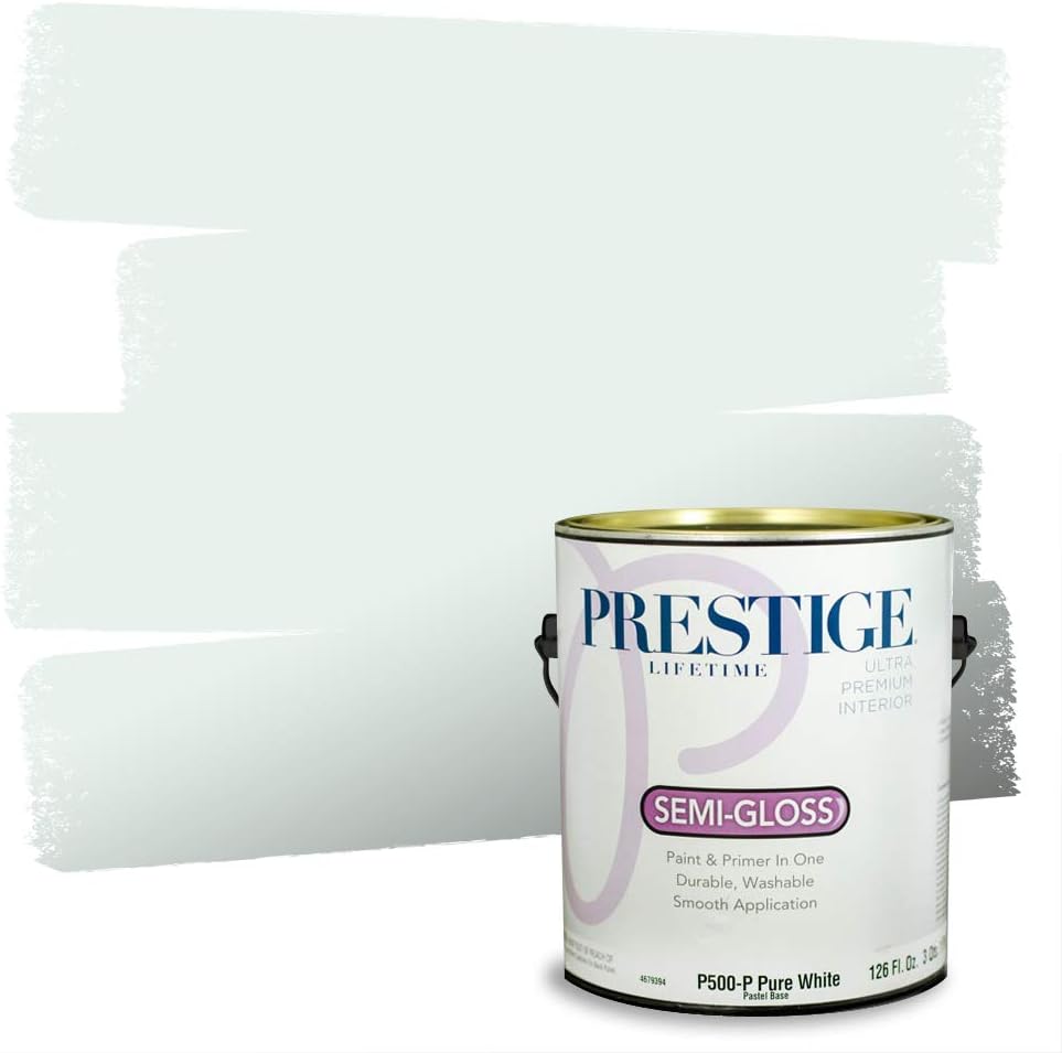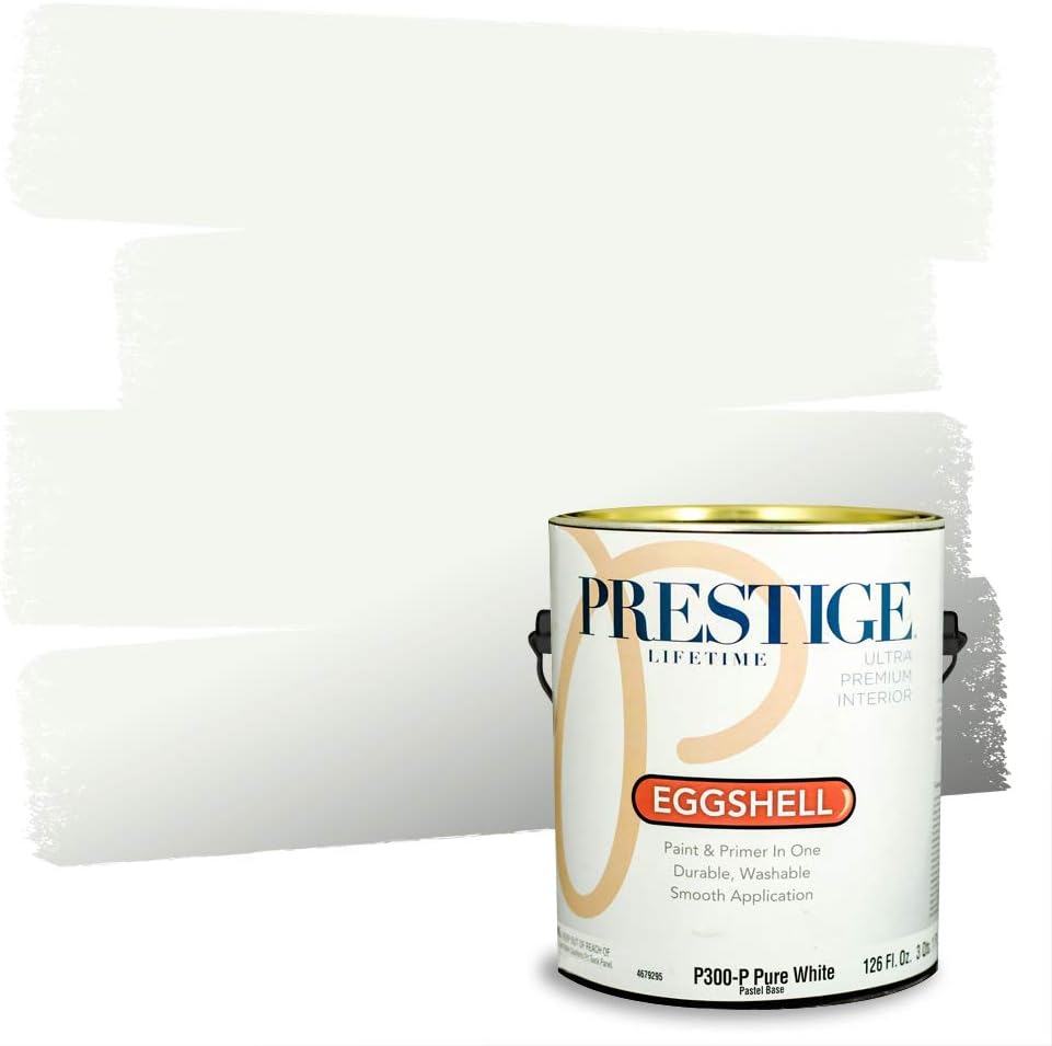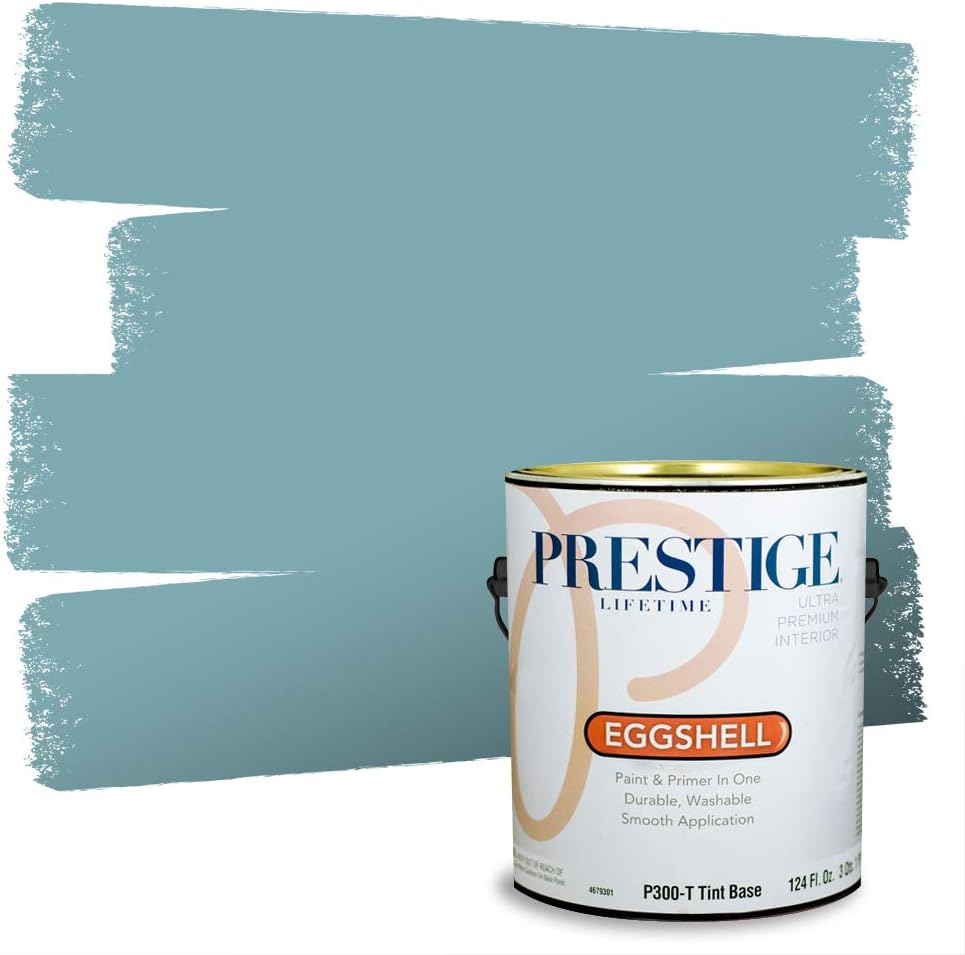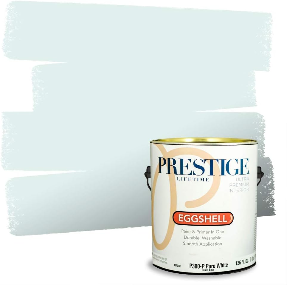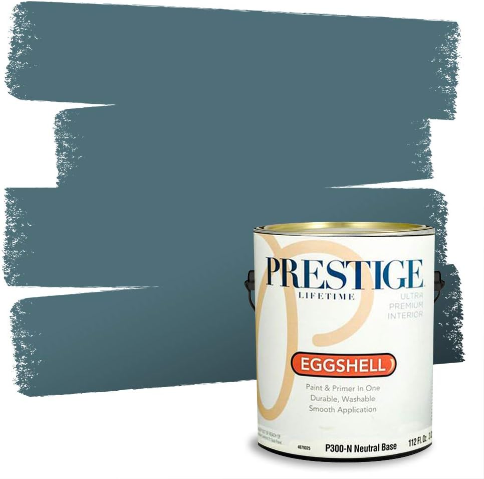 Prestige Paints Ultra Premium Acrylic Latex Interior Paint self-primes over properly prepared uncoated drywall, stucco, plaster or previously painted interior surfaces. Ideal for living rooms, family rooms, media rooms, bedrooms, dining rooms, and hallways. On stained or glossy surfaces use a stain blocking primer sealer. Certain colors may require more than one coat for complete hide. Actual paint colors may vary from on-screen and printer representation. Surface Preparation: All loose paint should be removed. The surface needs to be cleaned with detergent to remove dirt and grease and other contaminants. Rinse well to remove all soap residue and let dry. Scuff sand glossy surfaces and repair all imperfections. Remove dust with a damp cloth and allow to dry. New plaster must be properly cured. Patch cracks and holes, sand smooth when dry, then prime with this product. New woods may require and oil base primer/sealer. On metal use proper Rust Primer. Application: Stir or mix paint before using and intermix all containers for color uniformity. Apply this product as is with a high quality applicator such as a 3/8 inches nap roller cover, brush or pad painter. Thin sparingly with water if necessary for spraying. Dry Time: Dries in one hour. Recoat, if necessary, after four hours. Can clean gently with non-abrasive cleaner after 14 days. Cleanup: Use warm water and soap. An Eggshell finish is always a safe bet. It has a soft, washable look that works well in living rooms, family rooms and hallways. It gets its name from its distinctive effect that gives a painted surface the texture of an eggshell when viewed at an angle in the light. Eggshell finishes are low-gloss, but more reflective than flat sheens. Eggshell also is more easily cleaned than a flat finish and is more durable.