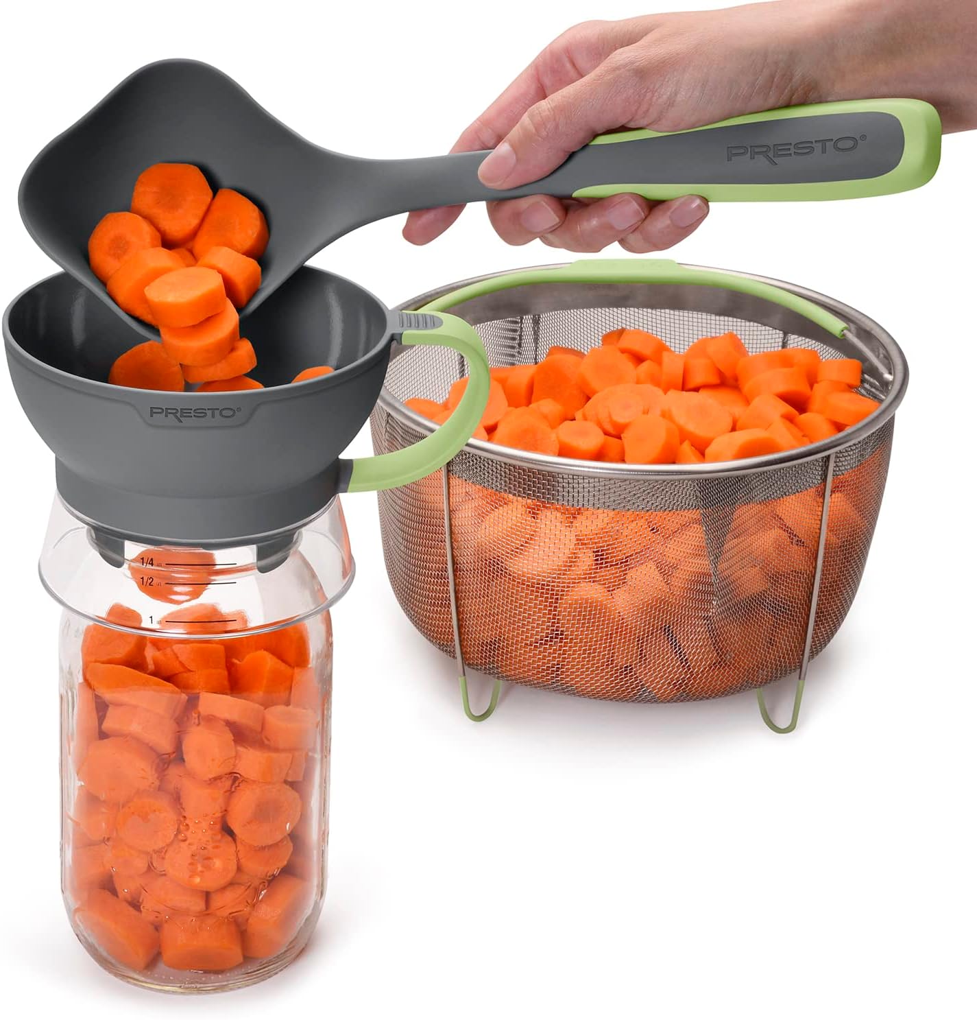 Get the most desired accessories for canning with the Presto® Premium Canning Kit. The 8-function set includes a deluxe canning funnel with headspace measure on both inner and outer collars, stainless steel blanching basket, spring-loaded jar lifter, wide-scoop ladle, and a bubble remover, magnetic jar lifter, and one-inch water measure multi-tool. Funnel fits on regular and wide mouth jars and keeps jar rims and counters clean!