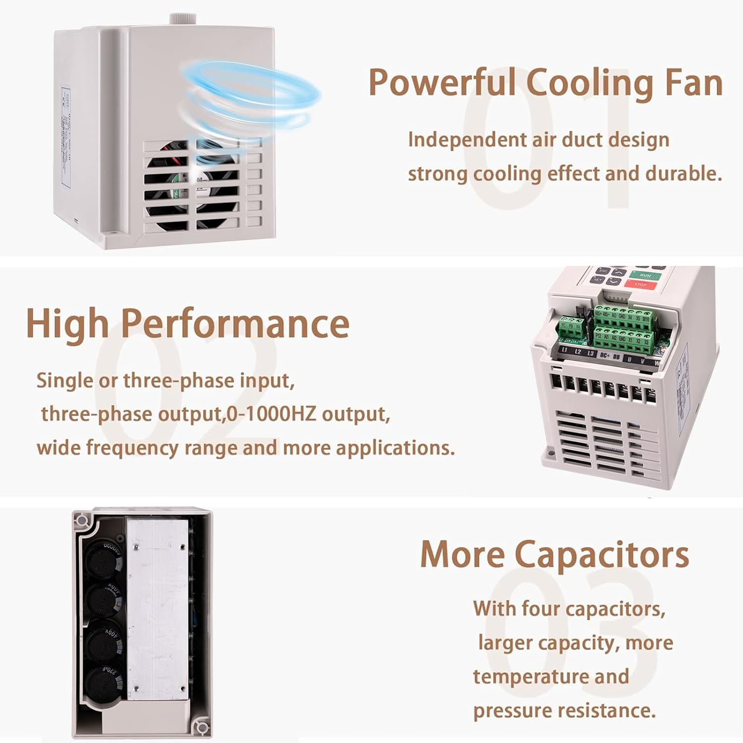 Air-Cooling Method & High Precision We achieve an effective heat dissipation through the built-in cooling fan, which necessitates no connection to water pumps or water pipes, rendering it a more convenient solution. Besides, this air-cooled spindle motor possesses the capability to adjust the offset with a precision of not exceeding 0.03mm, thereby guaranteeing high accuracy. 3KW 220V Variable Frequency Drive This VFD converter can be used for constant-torque loads ( air compressors, HVAC units, and other hard-start kits.) and variable-torque loads (pumps, fans, etc.). It can also be used as a motor speed controller and phase converter. This VFD features 1-phase input and 3-phase output, and you can adjust the speed as needed. Adopting sine wave PWN, this inverter’s control system features high torque drive, high-accuracy wide-range speed regulation that has 8-stage / 16-stage speed control, program operation, four settings of acceleration/deceleration time, and more.