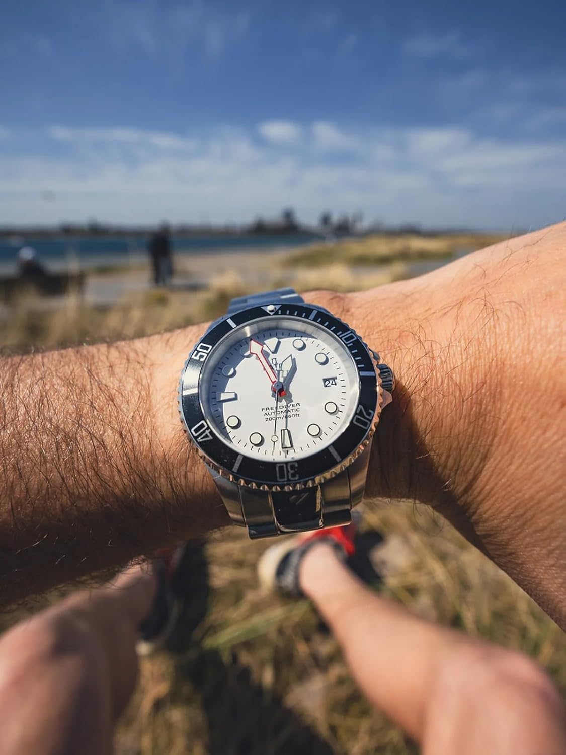 All-rounder StyleIntroducing a dive watch that blends a sleek look with rugged features that can withstand anything. A classic steel dive watch with a 316L stainless steel case and bracelet that exudes elegance, make it an ideal choice for both diving expeditions and everyday wear. Inspired by high-end watch designs by popular Japanese watch brands, the classic black dial with distinct hands and markers sits prominently to ensure readability in all conditions. The case back is engraved with the image of a free diver as a celebration of the sport. With an approximate case diameter of 40mm and thickness of 13mm, this watch offers a comfortable fit for any wrist, perfect for those who value style and substance.Efficient CraftsmanshipPowered by the reliable Automatic NH35 movement, this freediving watch stands out for its precise timekeeping and 40-hour power reserve. This movement is popular for driving the watch with a steady beat all day, both above and underwater. The dive watch also features a date window at 3 o'clock for added convenience to everyday life. Further sporting the benefit of an automatic dive watch, there is no need to change batteries from time to time. Crafted after the expert precision of popular Italian watch brands, this is a time piece that speaks for itself. Sea-bound AnytimeDesigned with a passion for deep sea diving, this ocean watch boasts a 200m water resistance and is rigorously pressure tested to ensure reliability under the sea. Its unidirectional rotating bezel, paired with a sapphire crystal featuring an anti-reflective coating, guarantees clear visibility and easy monitoring of dive times, enhancing safety underwater. The regular diver-style clasp, with fold-over lock and two-button deployment, ensures the watch stays secure on your wrist, no matter the adventure. This Diver watch ready for the sea offering peace of mind whether you're exploring ocean depths or navigating the challenges of daily life.