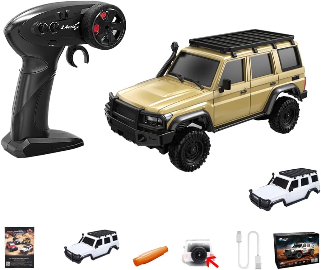 1/43 Scale Full-Proportional RC Crawler Model with APP Control, Dual Body ShellSpecifications: .Material: Plastic .Scale: 1:43 .Product Battery (mAh): 3.7V 180mAh (built-in) .Remote Controller Battery: 2 * "AA" (not included) .Charging: USB charging cable .Remote Time (minutes): 20 .Charging Time (minutes): 60 .Remote Distance (meters): 30 .Product Weight: 500g .Package Weight: 700g .Product Dimensions: 12 x 5 x 5cm .Package Dimensions: 21.5 x 13.5 x 17cm .Packing: Box .Age: 16+Package Including.Car *1.Remote Controller *1.Instruction Manual (English & Chinese) *1.Charging Cable *1.Replaceable Car Shell *1