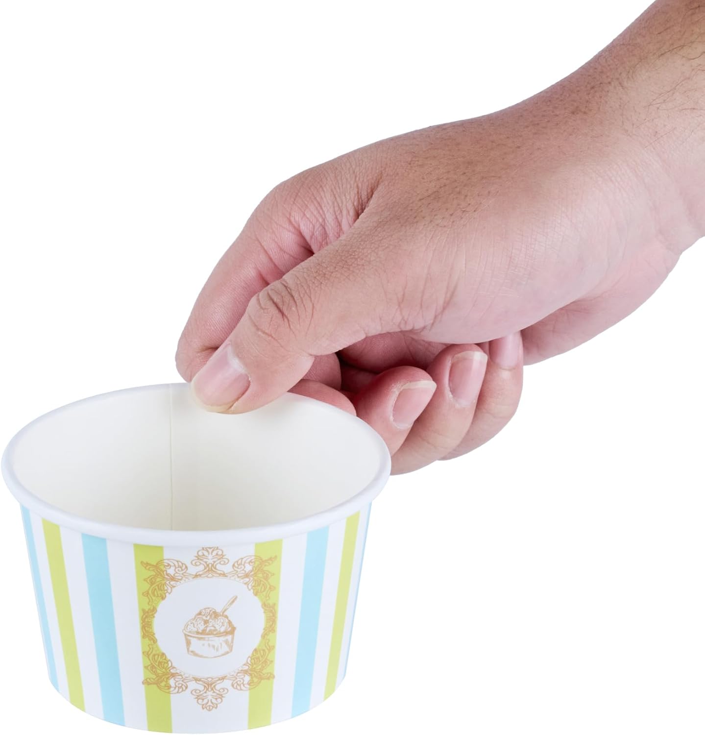 Prevent dessert disasters with leak-resistant ice cream cups. Coppetta Leak-Resistant Ice Cream Cups feature a sturdy double-coated design that prevents liquid leakage, ensuring mess-free service and satisfied customers. With an 8-ounce capacity, these frozen yogurt cups are perfect for serving moderate portions of ice cream, frozen yogurt, or other delicious desserts. The grease-resistant coating makes them ideal for oily snacks and treats, maintaining their structural integrity for a reliable dining experience. Constructed from durable paper, these cups provide sturdy support for both hot and cold foods, expanding your menu options to include items like macaroni and soup. The blue and green stripe design enhances visual appeal, making desserts more attractive and inviting to customers. Streamline your operations with these disposable ice cream cups, simplifying cleanup. Each order includes 200 Coppetta Leak-Resistant Ice Cream Cups.