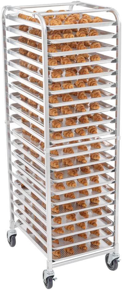Effortlessly store and distribute trays of food using our Kitchen Tek 20 Pan - Bun / Sheet Pan Rack. To facilitate proper and even cooling of baked goods, this sheet pan rack is constructed with an open side loading design. This baking tray rack highlights a full-height layout that can hold up to 20 full-size pans. Maintain the quality of your establishment's floors with the non-marking casters of this bun pan rack. To avoid unwanted, sudden movements, this side load rack is built with 2 locking and 2 non-locking casters. With 3-inch shelf spacing and 6 cross supports, this aluminum bun rack provides optimal sturdiness and stability. This silver sheet pan rack measures 28.25 inches long by 18 inches wide by 69.25 inches tall. With a total capacity of approximately 551 pounds, this cookie sheet rack is ideal for all kinds of delicacies. This full height rack is shipped unassembled. Sold in a 1 count box.
