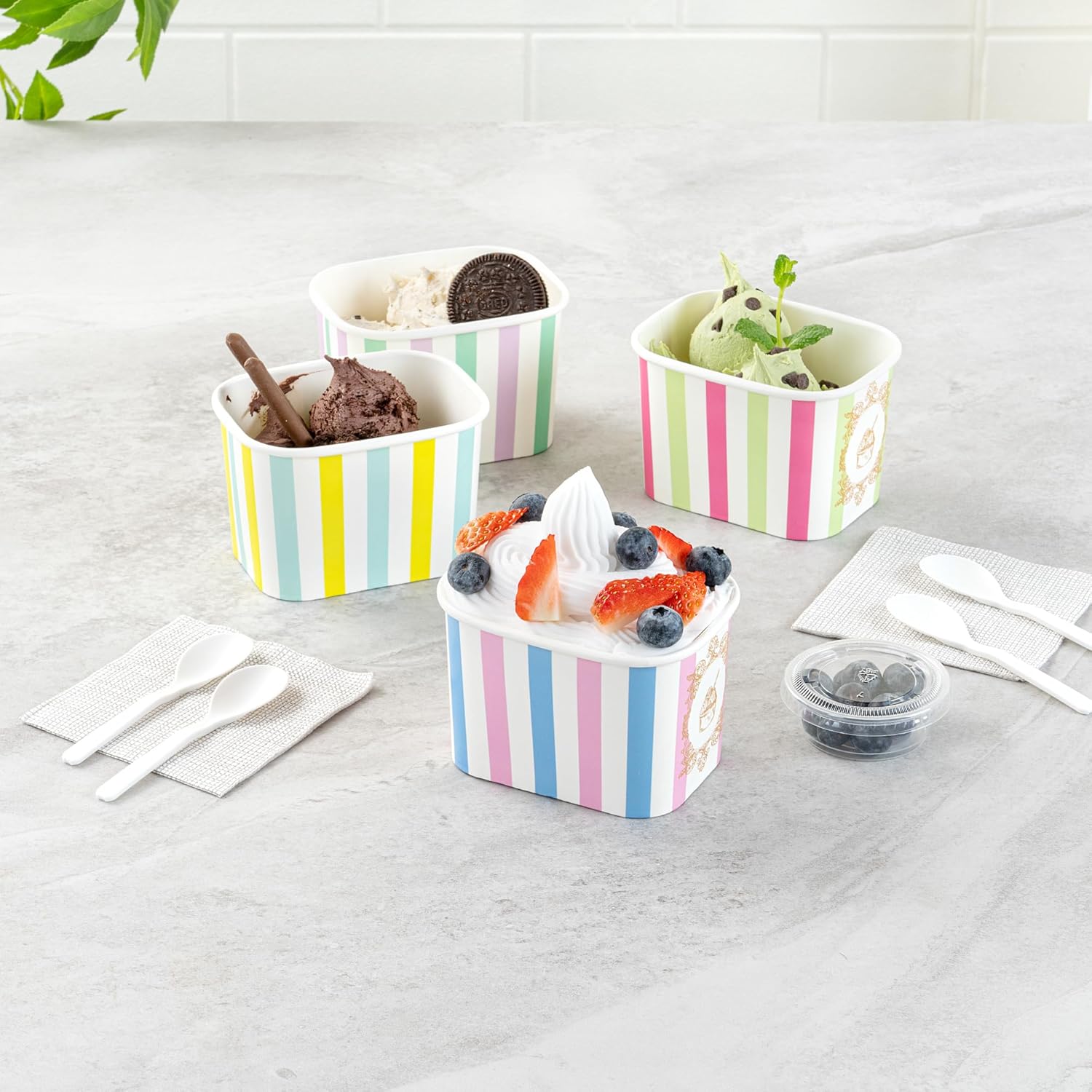 Serve desserts in style while maintaining cleanliness and sustainability. The Coppetta Leak-Resistant Ice Cream Paper Cup features a double-coated design that prevents liquid leakage, ensuring your ice cream paper cup stays clean and mess-free. With its cold and hot food-friendly capabilities, this dessert to-go cup expands your menu offerings, allowing you to serve everything from frozen yogurt to hot soups effortlessly. Crafted from paper, this disposable dessert cup supports sustainable disposal practices, aligning with eco-conscious initiatives. The vibrant square design with pink and blue stripes not only enhances the visual appeal but also provides a sturdy container, thanks to its robust paper construction. Measuring 4.25 inches by 3.25 inches by 2.75 inches, these cups are perfect for medium-sized portions, ideal for ice cream parlors and cafés aiming for efficient service and presentation. Each order includes 200 Coppetta Leak-Resistant Ice Cream Paper Cup.
