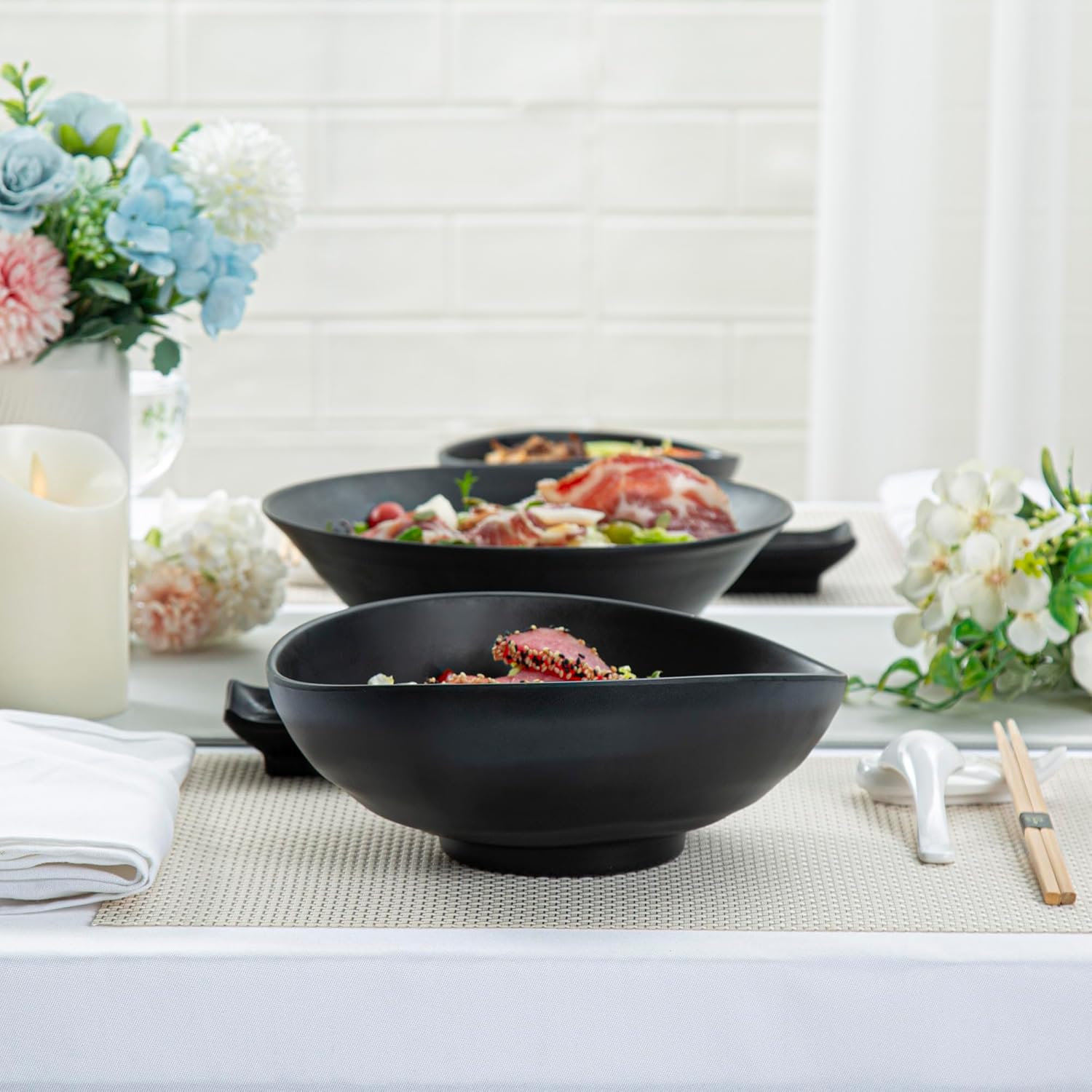 Present your fares with our Voga 44-ounce Round Black Melamine Freeform Large Bowls. These salad bowls are crafted from premium melamine for long-lasting durability that can withstand rigorous catering demands. The unique rim design of these melamine bowls creates an aesthetic look for your food presentation. Holding up to 44 ounces, these black bowls are perfect for serving controlled portions of your signature dishes. These serving bowls mimic the look of a black stone and complement all tablescapes with an Asian-inspired flair. To streamline your cleaning process, these soup bowls can be used in the top rack of a dishwasher. Measuring 9.5 inches long by 7.8 inches wide by 3.5 inches tall, these pasta bowls have a capacity of 44 ounces. Sold in a 2 count box.