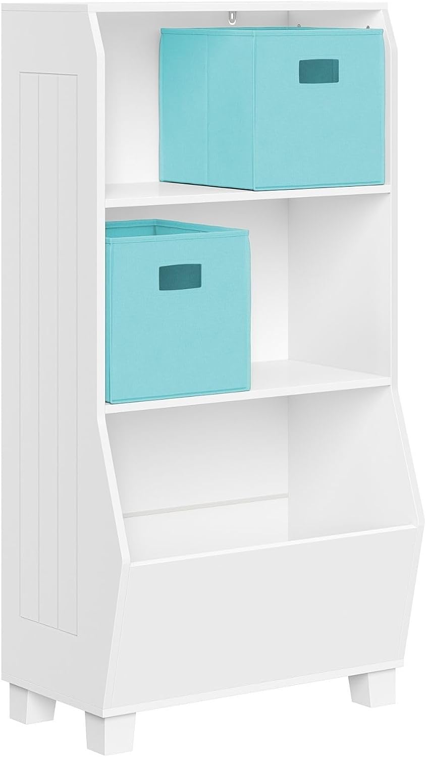 Clutter-Free Playroom Bliss Our Kids' Bookcase Toy Organizer is the ultimate solution for keeping your little one's playroom tidy and organized. With its two open shelves and a spacious storage bin, this versatile unit offers ample space for all their books, toys, and games. The deep veggie bin at the bottom serves as a convenient "dumping zone" for playroom clutter, making clean-up a breeze. No more tripping over scattered toys or hunting for misplaced books – our toy box with bookshelf keeps everything neatly in its place. Stylish and Functional Not only is our Kids' Bookcase Toy Organizer a practical storage solution, but it also adds a touch of style to any playroom or nursery. The open top shelf provides an ideal spot to display cherished picture frames, a piggy bank, or other sentimental items, creating a warm and inviting atmosphere. Designed with children in mind, this bookshelf for kids stands at just under 45" tall, ensuring easy access for little hands to reach their favorite toys and books. Safety First When it comes to your child's safety, our Kids' Bookcase Toy Organizer leaves nothing to chance. Equipped with two adjustable brackets, this kids' shelf can be securely anchored to the wall, preventing any accidental tipping or toppling. With its sturdy construction and thoughtful design, you can rest assured that your little one's playtime will be both enjoyable and secure. Embrace the joy of a clutter-free playroom and foster a love for reading and organization with this versatile kids' book storage solution. -44.63" tall kids' bookcase -2 open shelves, 1 large storage bin -Convenient 'dumping zone' for toys -Display shelf for frames, piggy banks -Includes adjustable wall-anchoring brackets Overall Width: 22.88 inches Overall Height: 44.63 inches Overall Depth: 13.75 inches Height of shelves: 11 inches Width of shelves: 21.75 inches Depth of shelves: 10.75 inches Height of veggie bin: 17.5 inches Depth of veggie bin: 13 inches