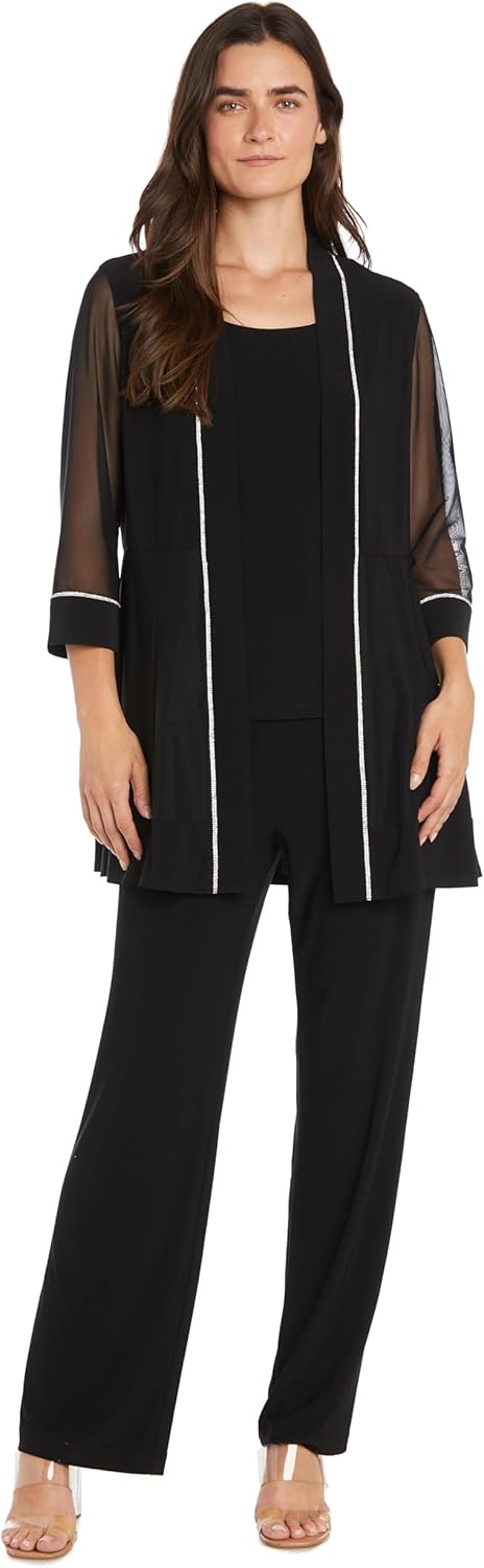 Discover this R&M Richards radiant ensemble, a beautifully designed two-piece mock pantsuit that embodies grace, confidence and modern sophistication. This elegant set pairs a flowing jacket with 3/4 mesh sleeves and rhinestone embellishments for a luminous touch. The coordinating elastic-waist straight-leg pants offer comfort and poise, ensuring aa flattering fit for every occasion. A matching necklace completes the look, creating an effortlessly polished appearance that requires no extra styling. Whether attending a wedding, evening celebration or a special dinner, this refined ensemble brings an air of timeless charm and contemporary elegance. Slip it on, add your favorite heels, and let this set do all the talk.