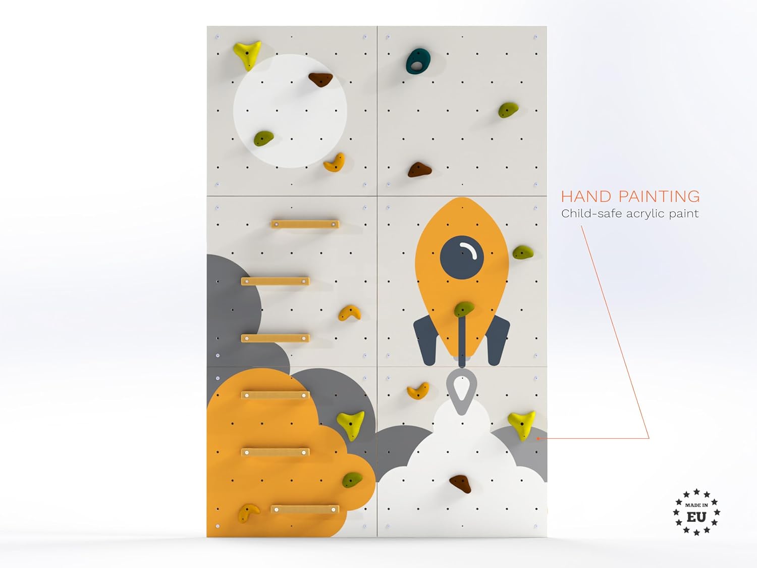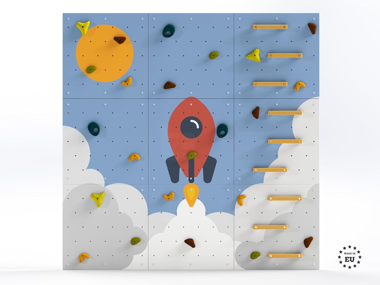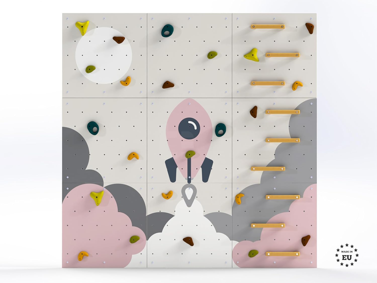 Transform any room into an exciting indoor climbing adventure with this captivating rocket-themed climbing wall by TetisWood. This large-scale installation features a whimsical space design with adorable rocket ships soaring through fluffy clouds against a serene backdrop of white, blue, and gray panels. The wall comes complete with various climbing holds in yellow, brown, green, and black, plus wooden training bars, offering multiple routes and challenges for young climbers. Perfect for playrooms, bedrooms, or recreational spaces, this climbing wall helps develop strength, coordination, and problem-solving skills while sparking imagination through its delightful space theme. The modular panel system allows for customized installation, while the professional-grade construction ensures durability and safety. The wall's thoughtful design includes pre-drilled holes for proper mounting and features both challenging climbing elements and decorative artwork that enhances any interior space. Made in the EU, this climbing wall creates an engaging activity center that will keep children entertained while developing their physical abilities. 🎁 Perfect birthday and Christmas gift for your kids. 📌SPECIFICATION ✔ Set 3 panels / 15 stones height: 195 cm / 76,77 incheswidth: 65 cm / 25,59 inchesdepth: 1.5 cm / 0,39 inches✔ Set 6 panels / 30 stones height: 195 cm / 76,77 incheswidth: 130 cm / 51,18 inchesdepth: 1.5 cm / 0,39 inches✔ Set 9 panels / 45 stones height: 195 cm / 76,77 incheswidth: 195 cm / 76,77 inchesdepth: 1.5 cm / 0,39 inches✔ Set 12 panels / 60 stones height: 195 cm / 76,77 incheswidth: 260 cm / 102,36 inchesdepth: 1.5 cm / 0,39 inches✔ Set 15 panels / 75 stones height: 195 cm / 76,77 incheswidth: 325 cm / 127,95 inchesdepth: 1.5 cm / 0,39 inches✔ Set 18 panels / 90 stones height: 195 cm / 76,77 incheswidth: 390 cm / 153,54 inchesdepth: 1.5 cm / 0,39 inchesMaterial: birch plywood 1.5 cm / 0,39 inchesLoad capacity: 75 kg / 165.34 lbAll hardware included