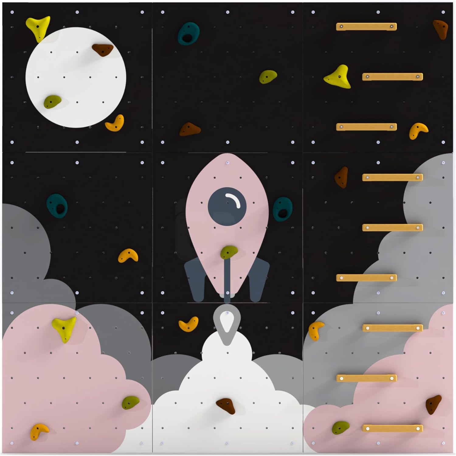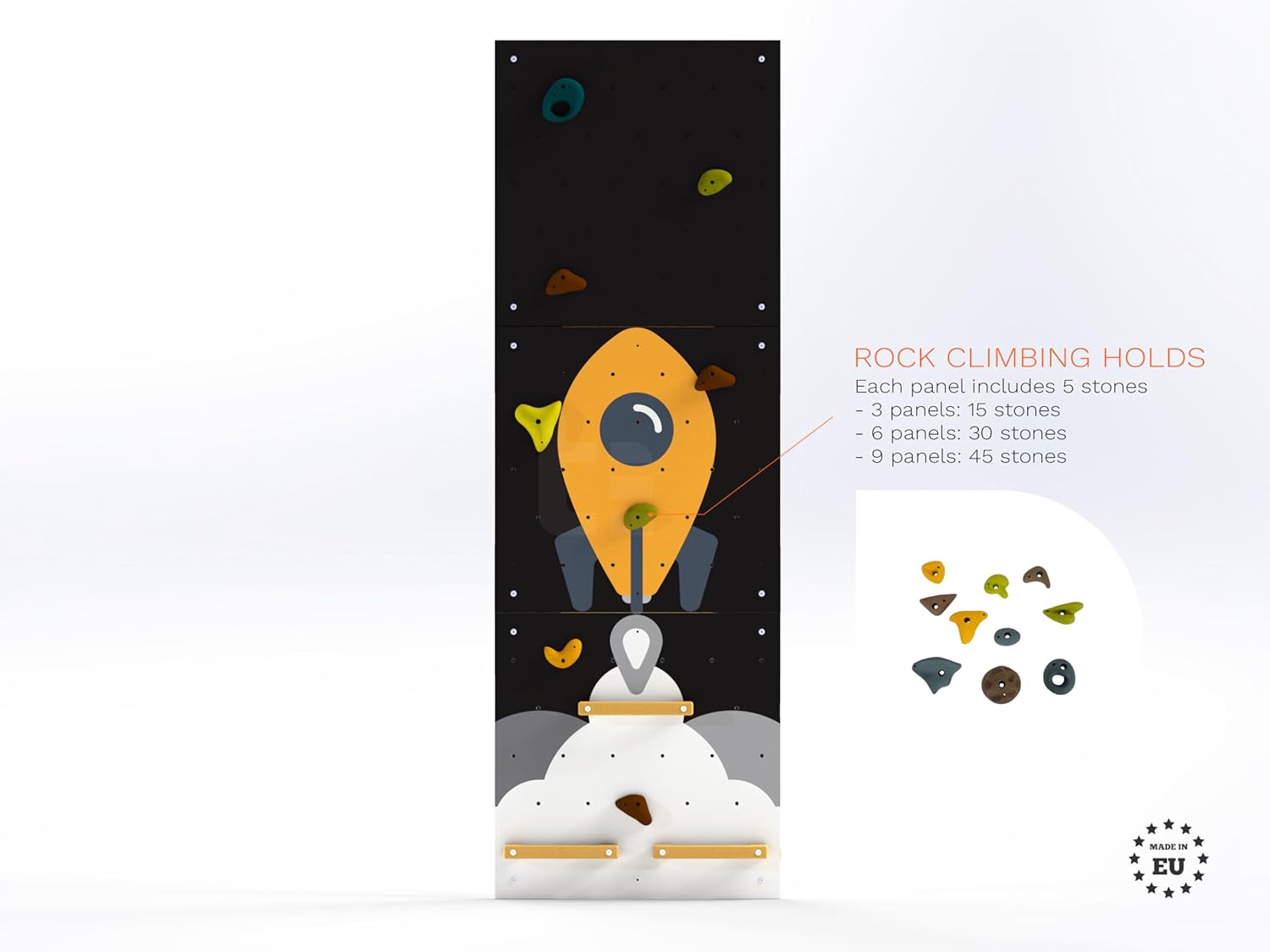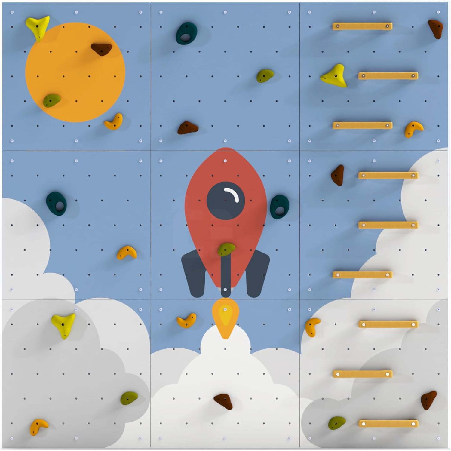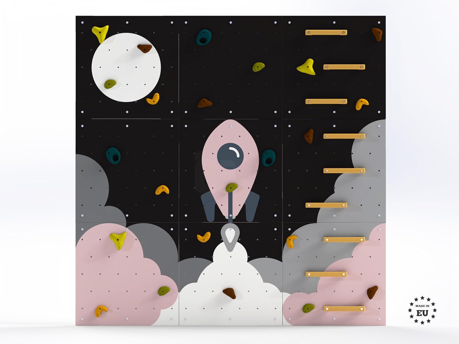 Transform any room into an exciting indoor climbing adventure with this captivating rocket-themed climbing wall by TetisWood. This large-scale installation features a whimsical space design with adorable rocket ships soaring through fluffy clouds against a serene backdrop of white, blue, and gray panels. The wall comes complete with various climbing holds in yellow, brown, green, and black, plus wooden training bars, offering multiple routes and challenges for young climbers. Perfect for playrooms, bedrooms, or recreational spaces, this climbing wall helps develop strength, coordination, and problem-solving skills while sparking imagination through its delightful space theme. The modular panel system allows for customized installation, while the professional-grade construction ensures durability and safety. The wall's thoughtful design includes pre-drilled holes for proper mounting and features both challenging climbing elements and decorative artwork that enhances any interior space. Made in the EU, this climbing wall creates an engaging activity center that will keep children entertained while developing their physical abilities. 🎁 Perfect birthday and Christmas gift for your kids. 📌SPECIFICATION ✔ Set 3 panels / 15 stones height: 195 cm / 76,77 incheswidth: 65 cm / 25,59 inchesdepth: 1.5 cm / 0,39 inches✔ Set 6 panels / 30 stones height: 195 cm / 76,77 incheswidth: 130 cm / 51,18 inchesdepth: 1.5 cm / 0,39 inches✔ Set 9 panels / 45 stones height: 195 cm / 76,77 incheswidth: 195 cm / 76,77 inchesdepth: 1.5 cm / 0,39 inches✔ Set 12 panels / 60 stones height: 195 cm / 76,77 incheswidth: 260 cm / 102,36 inchesdepth: 1.5 cm / 0,39 inches✔ Set 15 panels / 75 stones height: 195 cm / 76,77 incheswidth: 325 cm / 127,95 inchesdepth: 1.5 cm / 0,39 inches✔ Set 18 panels / 90 stones height: 195 cm / 76,77 incheswidth: 390 cm / 153,54 inchesdepth: 1.5 cm / 0,39 inchesMaterial: birch plywood 1.5 cm / 0,39 inchesLoad capacity: 75 kg / 165.34 lbAll hardware included