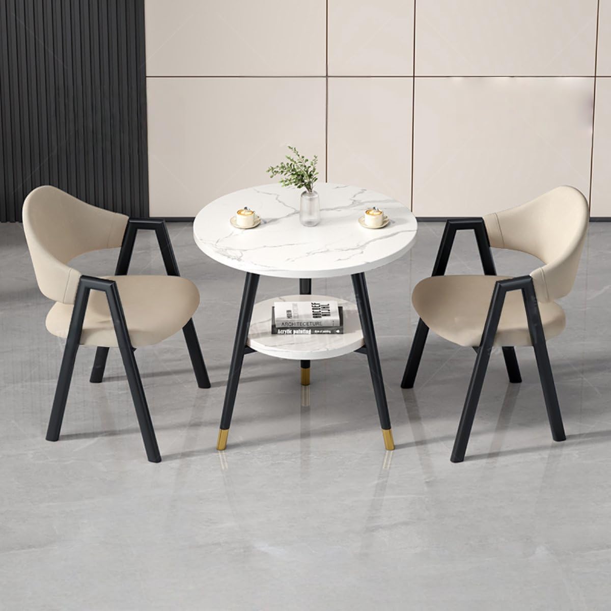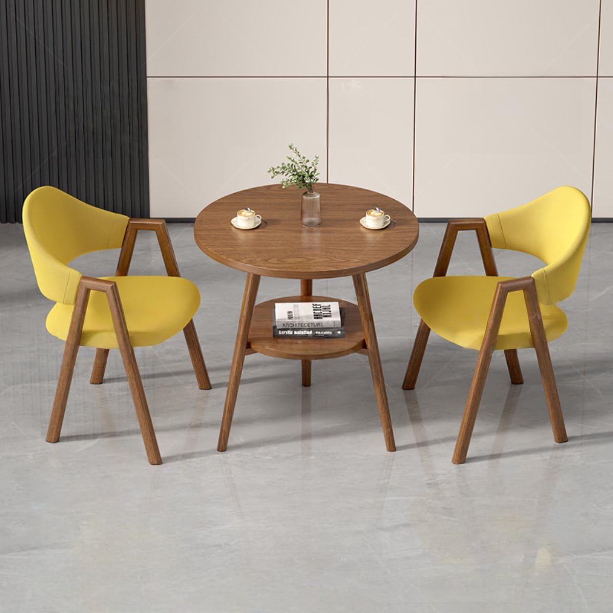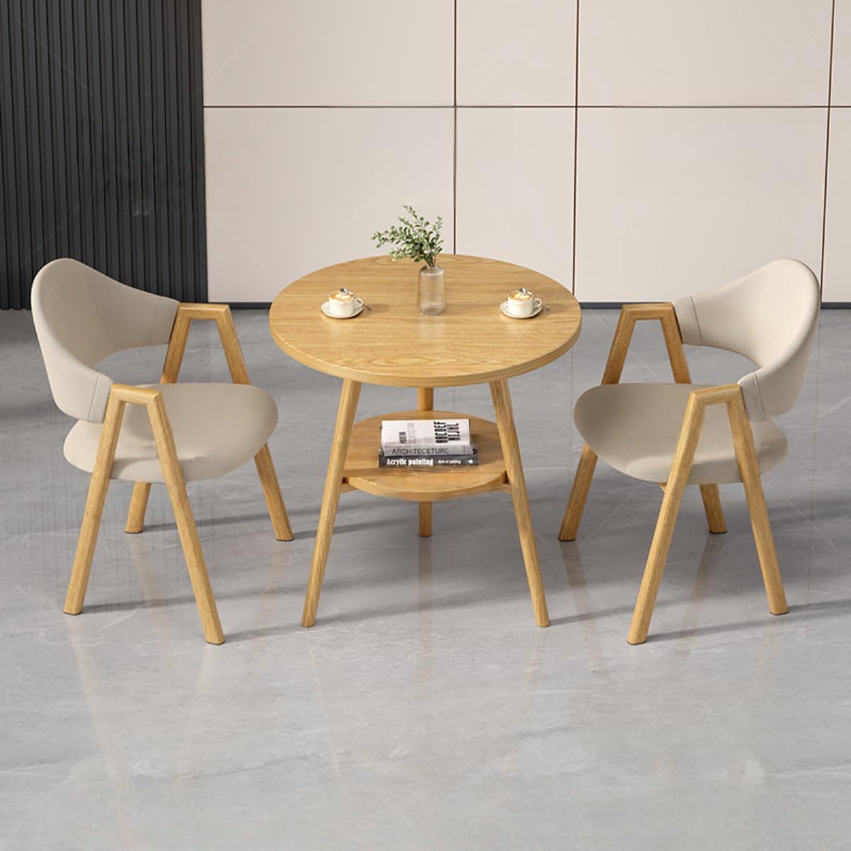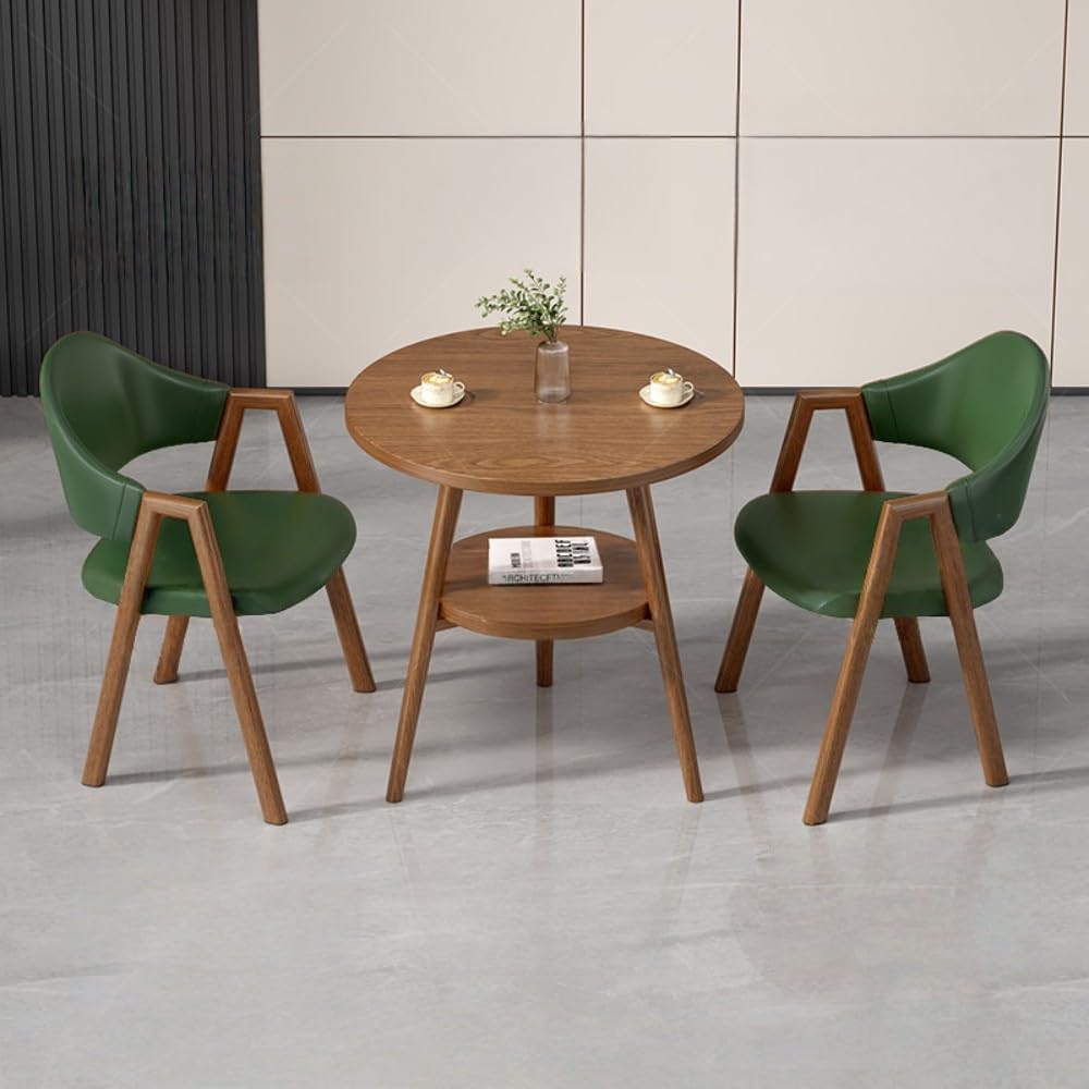 Item Name: Round Reception Room Table and Chair Set Table Size: Diameter 60cm, Height 75cm; Chair Size: W54xD40xH78cm, Seat Height 64cmMaterial: Imitation Wood Grain Finish Carbon Steel Frame, Fabric or PU Leather, High-Density Sponge Feature: Eco-friendly design with a imitation wood grain carbon steel frame; ergonomically matched chairs with textured Fabric or PU leather seats; durable load-bearing capacity of 200kg+. Applicable Scenarios and Occasions: Perfect for offices, reception areas, lounges, conference rooms; ideal for business meetings or casual coffee breaksStyle/Appearance: Sleek, modern A-shaped design with a sophisticated wood grain finish for a stylish touch. Origin: China