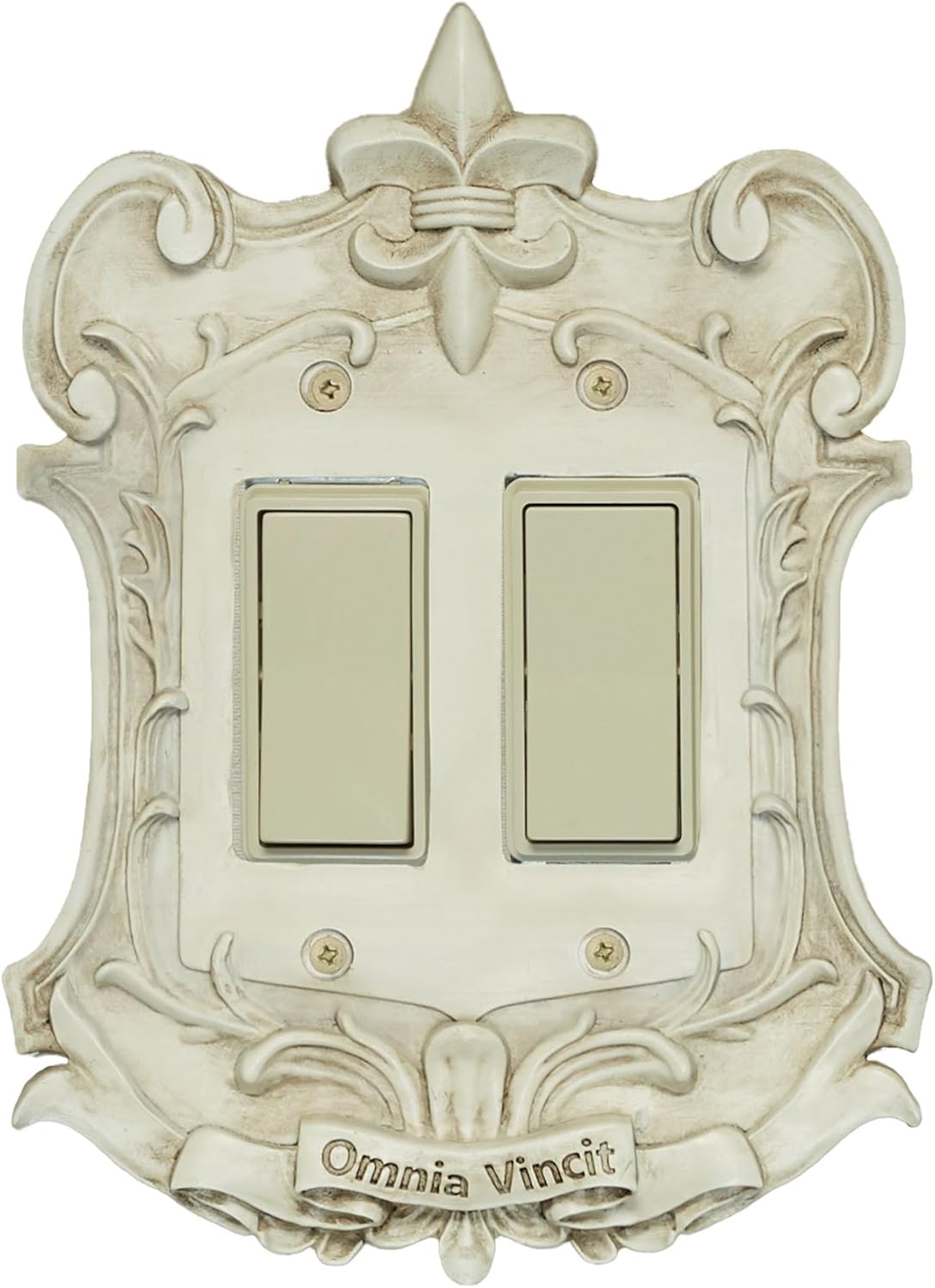 A Royal Switchplate adds a regal finishing touch to your room and elevates your space. The resin plate cover features stately scrolls, a grand banner, and lovely fleur-de-lis topper. The banner at the bottom reads "Omnia Vincit," which means "He Conquers All" in Latin. The rich texture, dimensional design, elegant aged gold finish, and antique wash inspires the luxurious flair of an Old World manor steeped in vintage, antique finery. The Single Rocker Switch size can fit dimmer switches, rocker switches, or GFCI outlets. The single design measures 4.5"Wx1"Dx8"H. Color-matching paint-tipped screws are included; do not over-tighten screws. Due to the thickness of the dimensional design, the outlet plate may not be able to support large adapters, chargers, or nightlights.