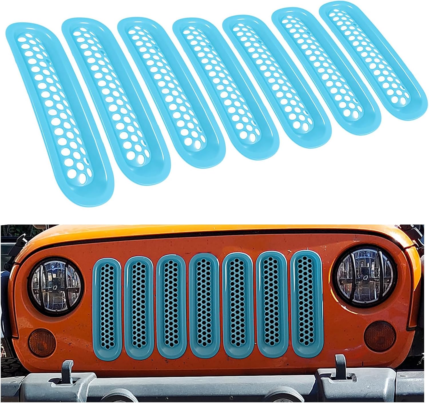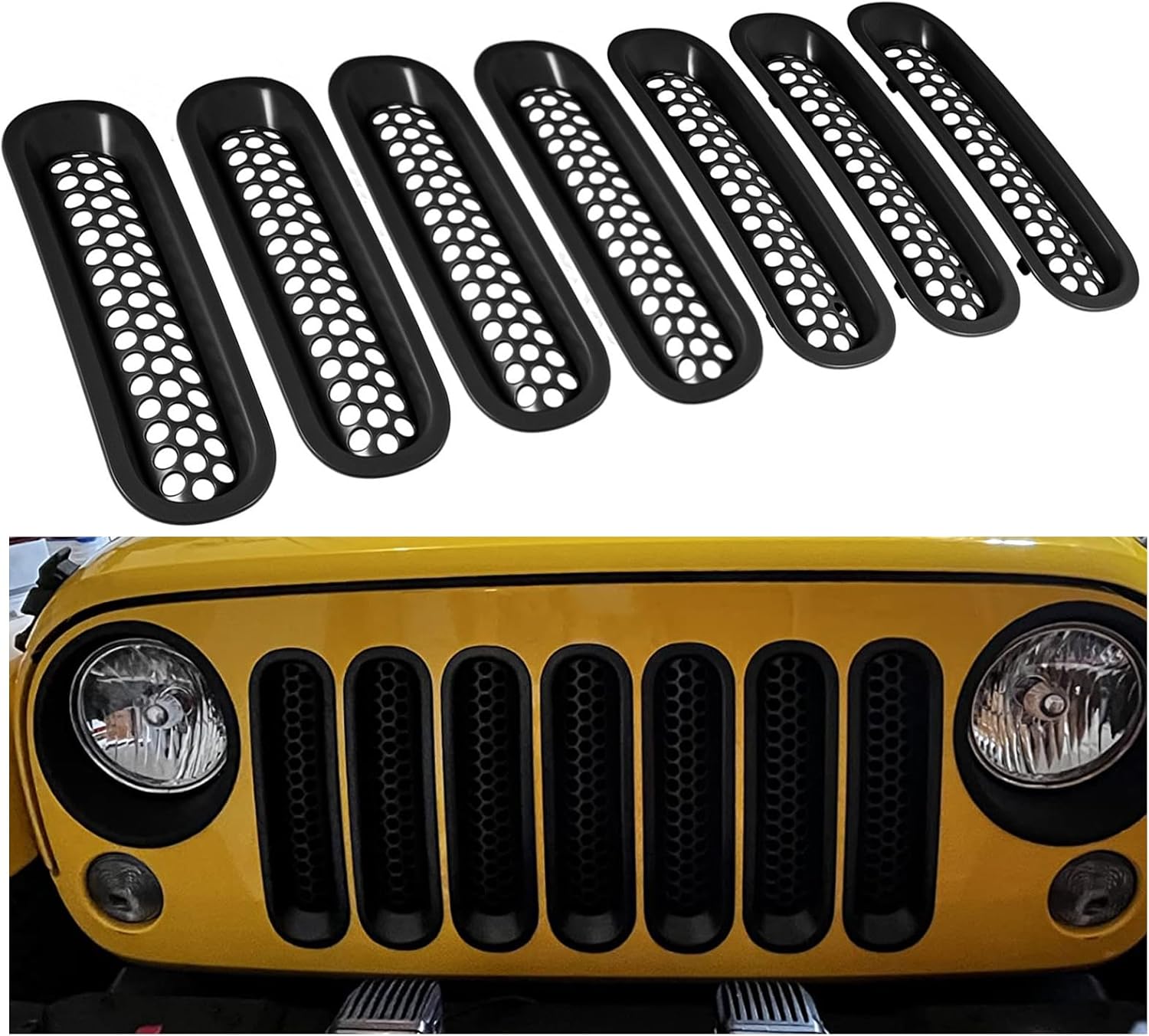 Specification Quantity: 7 pcs / Set Size : 12.72 inches×3.66 inches (32.3*9.3 cm) Condition: 100% new Color: Pure color Material: ABS Fit Model: Fit For Jeep Wrangler JK JKU Unlimited Sport Freedom Rubicon Sahara 2-Door and 4-Door 2007-2017 ( NOT FIT for Jeep Wrangler Unlimited Sahara 2016-2017) Tips: (Only Fit Original Factory Front Grill). Color may vary slightly due to the color setting of each individual monitor: Feature: 1) Made of 1:1 according to the original car front grill . 2) Made by high quality ABS plastic for durability and undeformed. 3) Easy installation with no drilling. 4) Stable characteristics, high reliability. 5) Decorate your car make it charming fashion and vivid.