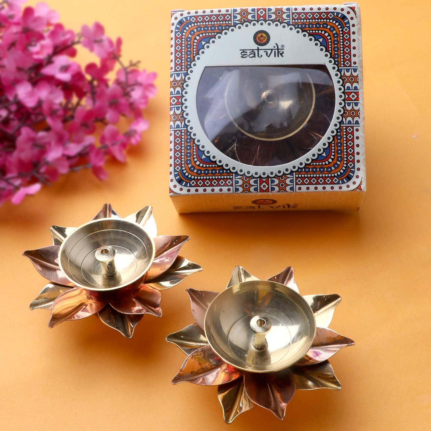 Satvik Brass Copper Lotus Designer Metal Diya used for lighting lamp using cotton wicks. It is an integral custom or tradition to start all the auspicious events by lighting the lamp to create a spiritual atmosphere. Diyas are an essential part of Indian Festive Occasions or Diwali decorations. To considering this we came with beautiful range of Diwali Collections. You can decor your home on the Diwali festival with Diya, Tea-light holders, oil lamp, earthen diya, traditional diya, natural diya, colorful diya, designer diya, clay diya, terracotta diya, plain diya, stone diya, metal diya, shadow diya, door valance, toran, rangoli, colors, puja thali, pooja thali, platter, frills, hanging ball, paper lentern, big diyas, laxmi ganesha statue, luxmi, lakshmi, lord ganesha, Ganpati, diwali pujan, deepmala. Diwali Candles, Candle Holders, Candle Stand, Tea Light candle Holder. Use the above items to decorate your home.