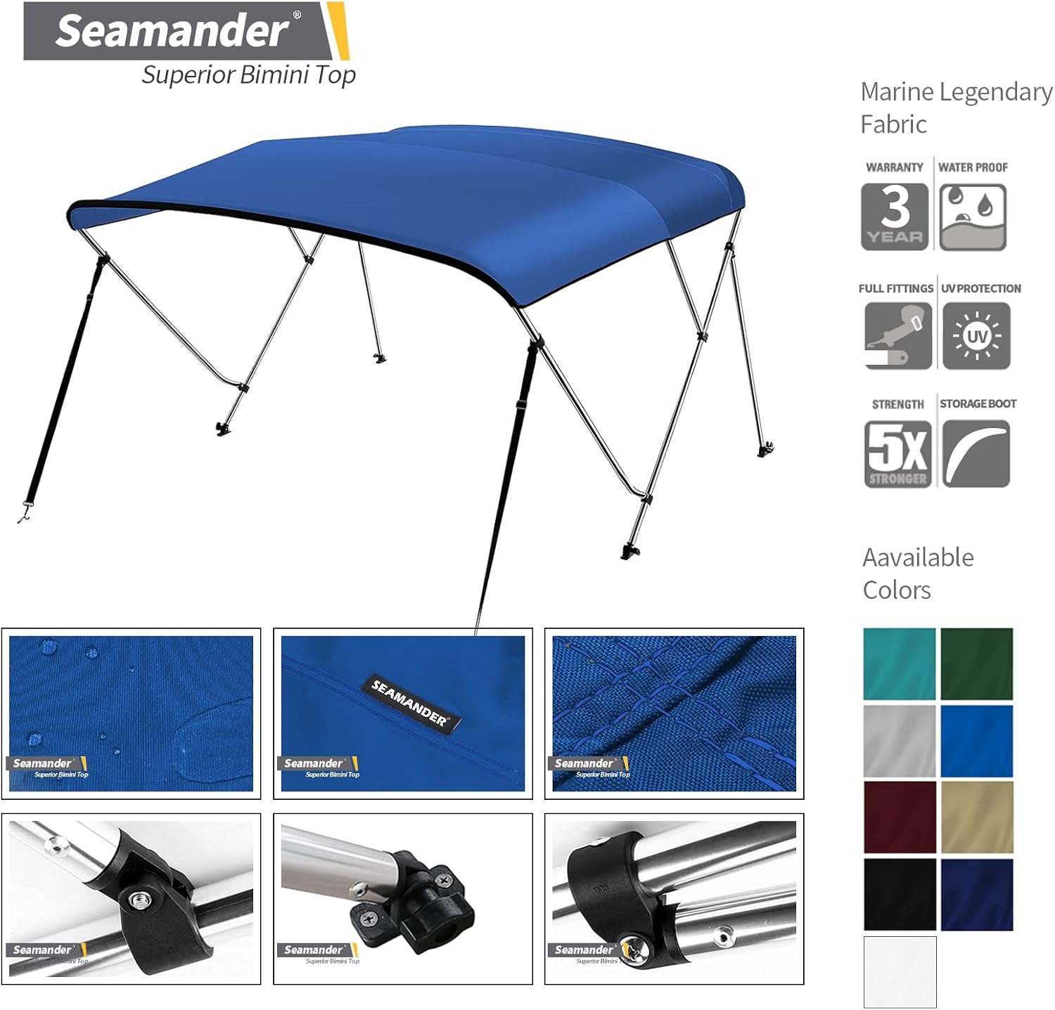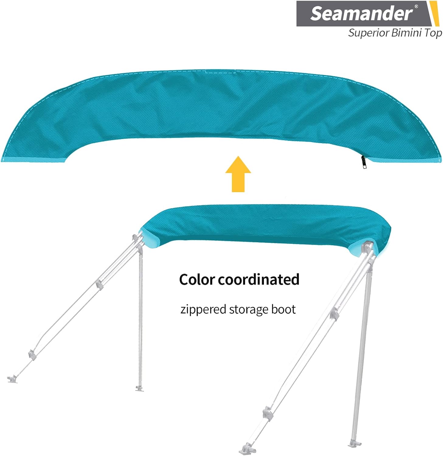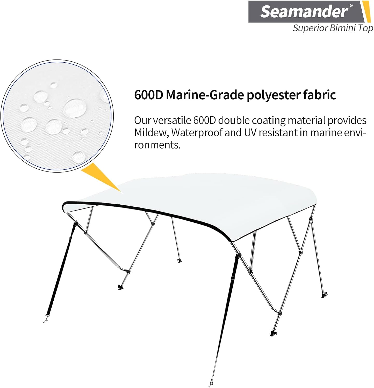 Seamander Bimini Top Boat Cover Top is made of 8.5 oz. 600D marine-grade polyester with double PU back coating fabric and 1" Dia. Anodizing Aluminum Frame. This item contains all hardware including: S.S. Saddles, S.S. screws, S.S. Hooks, Nylon Deck Mounts, Jaw slides etc. Seamander Bimini Top Boat Cover Top is a Two straps &Support pole for front and rear with storage boot. Packing List: Bimini Top Canopy x 1PCS Bimini Top Storage Boot x 1PCS Bimini Top Frame x 1 SET Bimini Top Hardware Box x 1PCS Installation Paper x 1PCS Bimini Top Hardware Box contains: Thumb Screws x 4PCS Nylon Deck Mount x 2PCS Nylon Straps with S.S. Hook x 2Sets S.S. Saddle x 2PCS Self-steel screw x 12PCS S.S. Bolt x 6PCS S.S. Hexagonal Nut x 8PCS Note: This item is partially assembled and packaged. one or two people can well accomplish the job in few minutes.