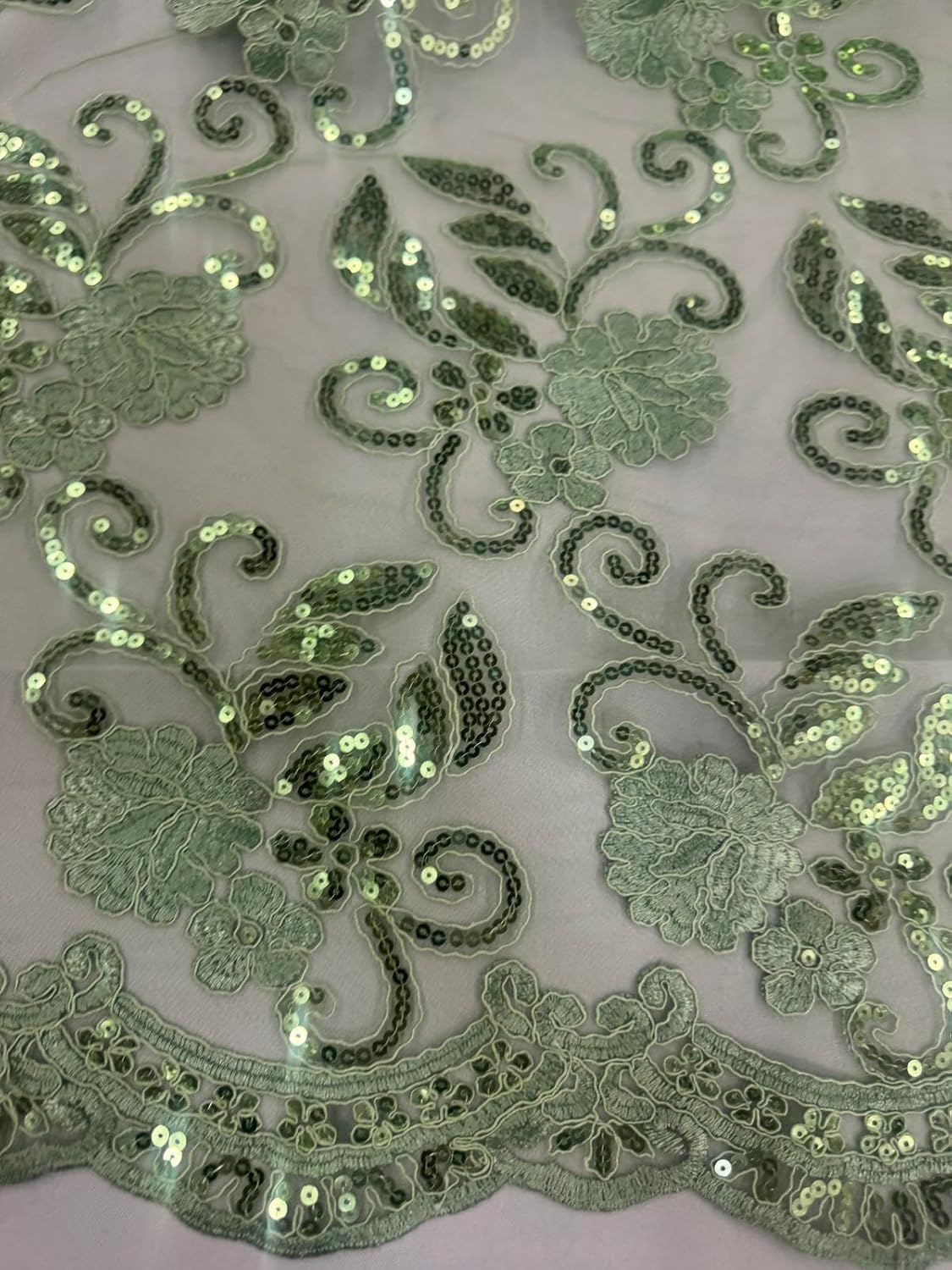 The Sedona Designz 48/50" Wide Corded Queen Floral Lace Fabric with Sequins is an exquisite embroidered mesh textile crafted for high-end sewing, formal wear, and elegant décor projects. Featuring an intricate floral pattern enhanced with delicate corded detailing, this fabric brings depth, texture, and luxurious character to any creation. The lightly shimmering sequins are artistically stitched throughout the design, giving the material a graceful sparkle that catches the light beautifully without overpowering the pattern.Woven on a soft, flexible mesh base, this fabric drapes smoothly and offers excellent workability for dressmakers, designers, and craft enthusiasts. The scalloped edges on both sides add a refined finish—perfect for hems, sleeves, veils, and decorative overlays without additional trimming. Ideal for prom dresses, bridal gowns, evening wear, saree blouses, lehengas, event backdrops, table décor, and sophisticated DIY crafts.Whether you’re creating a one-of-a-kind formal garment or enhancing a décor piece with a touch of elegance, this embroidered lace fabric delivers premium quality, timeless beauty, and stunning visual appeal suitable for all special occasion applications.