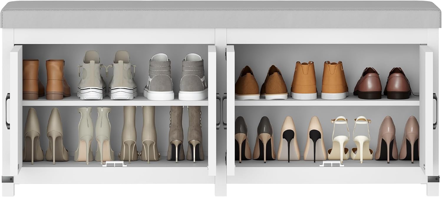 Shoe Storage Bench, 2 Tier Shoe Bench with Padded Seat Cushion & 4 Barn Doors, Entryway Bench with Adjustable Shelf, Farmhouse Shoe Cabinet for Living Room, Bedroom, White SB31203GY