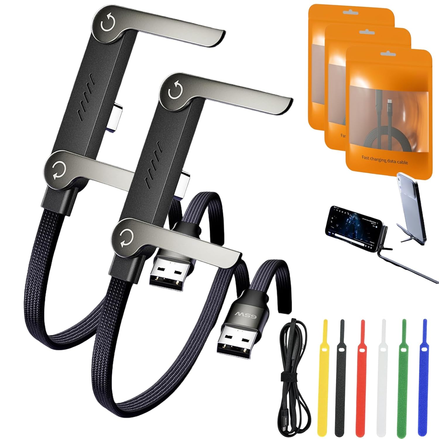 Features: 1.240W Fast Charging:Delivers high-speed power up to 240W for rapid charging of appliance phones and tablets during use. 2.2-in-1 with Hidden Phone Stand:Combines a charging cable with a discreet, foldable stand for hands-free viewing and calls. 3.Fast Data & Wide Compatibility:Supports high-speed file transfer and is broadly appliance with Type-C devices. 4.Ergonomic 90-Degree Connector:Elbow design reduces port strain and provides comfortable handling during extended use. 5.Fearless of Prolonged Use& Portable with Management Tool:Features tangle-resistant nylon braid, 5-foot length, and includes a cable organizer. Specification: Name:Charge Stand 2 in 1 Cable Outer Material: Pp+Nylon Size: 5ft/1.5m Color: Black Package Includes: 1 Pcs * Charge Stand 2 in 1 Cable 5 Pcs * Cable Management