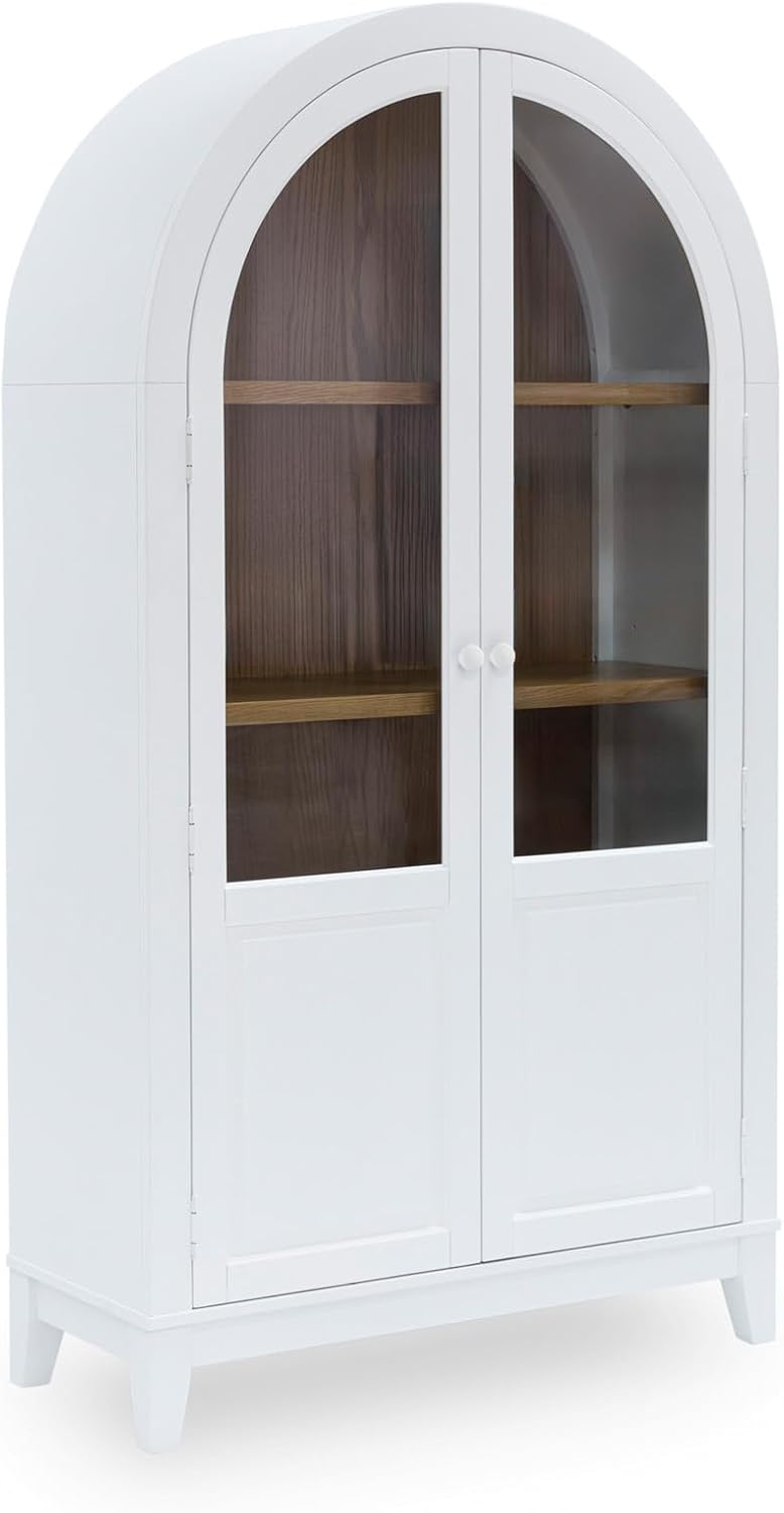 This accent cabinet is a stunning marriage of architectural intrigue and sophisticated storage. Its glass-paneled doors and natural wood tone create an inviting warmth well-suited to transitional spaces. Ideal for showcasing fine china or storing everyday essentials, this versatile piece proves that practical storage can be utterly beautiful.