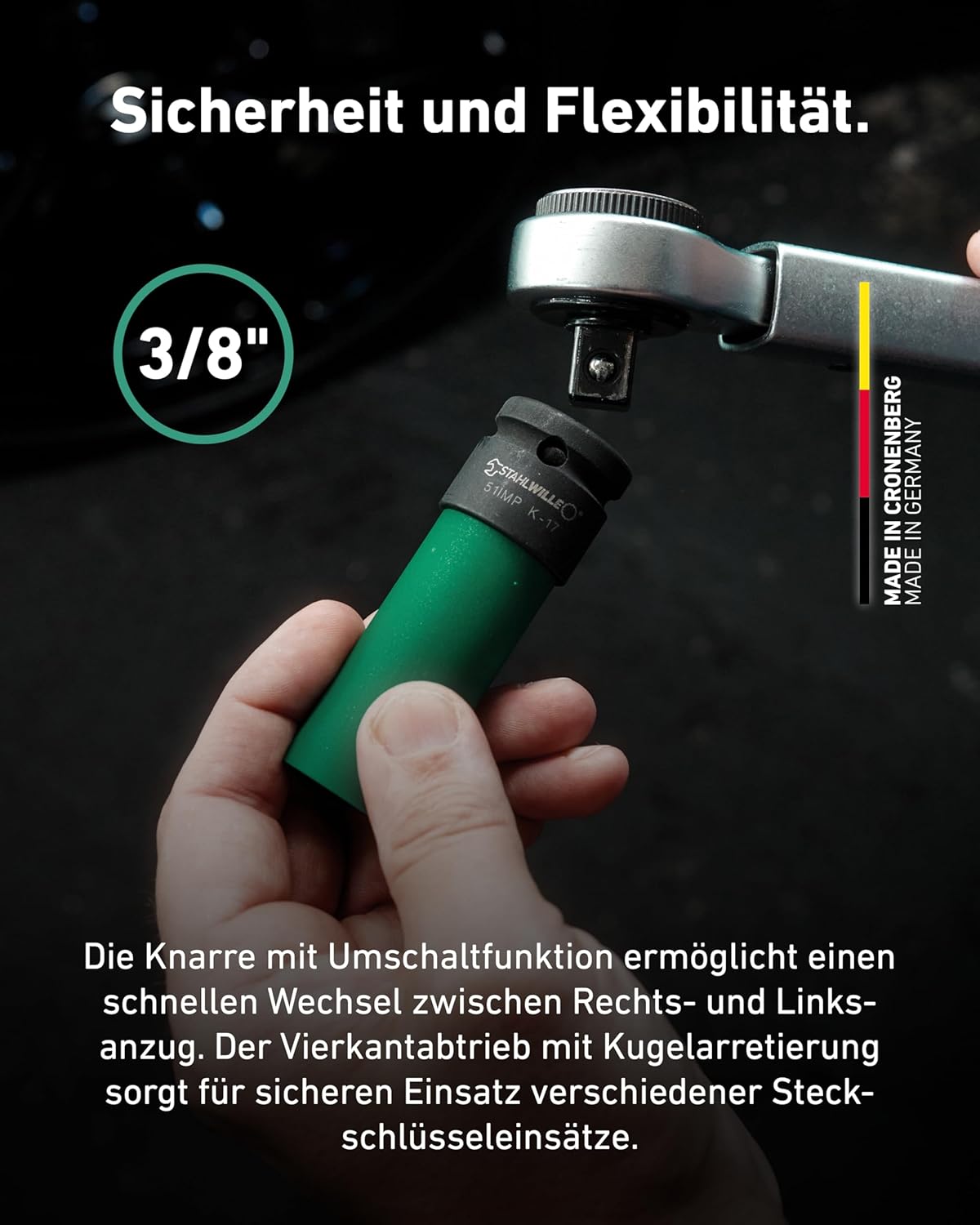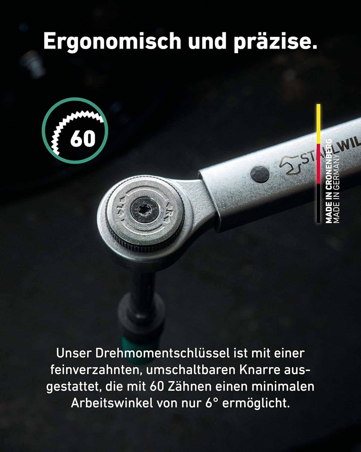 The STAHLWILLE 750NR/100 torque wrench is a top-class precision tool, developed and manufactured in Germany. With a measuring range of 10-100 N·m and a 3/8 inch reversible ratchet, it offers the highest accuracy when tightening screw connections. The ergonomic 2-component handle allows fatigue-free work, while the easy-to-read double scale in N·m and ft·lb guarantees precise adjustment. The QuickSelect quick adjustment is particularly user-friendly - one turn of the knob at the end of the handle corresponds to 5 N·m. The robust spring mechanism in combination with the 60 teeth reversible ratchet ensures reliable durability. A clearly noticeable and audible double stop signal indicates the achievement of the set torque. The setpoint torque fixing by locking prevents unintentional adjustment of the set torque value during work. The key is ready to use again immediately after relief and is ideal for professional use in industry and trade.