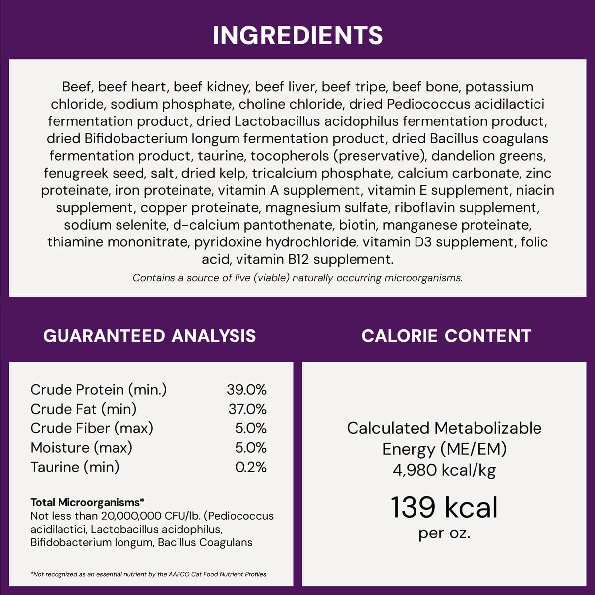 Give your cat the natural, protein-rich nutrition they deserve with Stella & Chewy's Freeze-Dried Raw Cat Dinner Morsels. Each batch starts with 98% grass-fed beef, organs, and bone—mimicking your cat's ancestral diet for optimal health and satisfaction.Crafted for versatile feeding, these morsels can be served three ways: as dry treats, crumbled as a tasty meal topper, or rehydrated with warm water for a complete nutritious meal. This flexibility helps you customize your cat's feeding experience while maintaining premium nutrition.Our minimally processed freeze-dried technique preserves natural nutrients without artificial preservatives. We source only high-quality, responsibly raised grass-fed beef and 100% organic certified produce—delivering pure, natural nutrition that health-conscious pet owners trust.Proudly made in our own USA kitchen with stringent quality controls, we're committed to providing the highest level of nutrition for your beloved companion. For optimal freshness after opening, we recommend transferring unused portion to an airtight container.