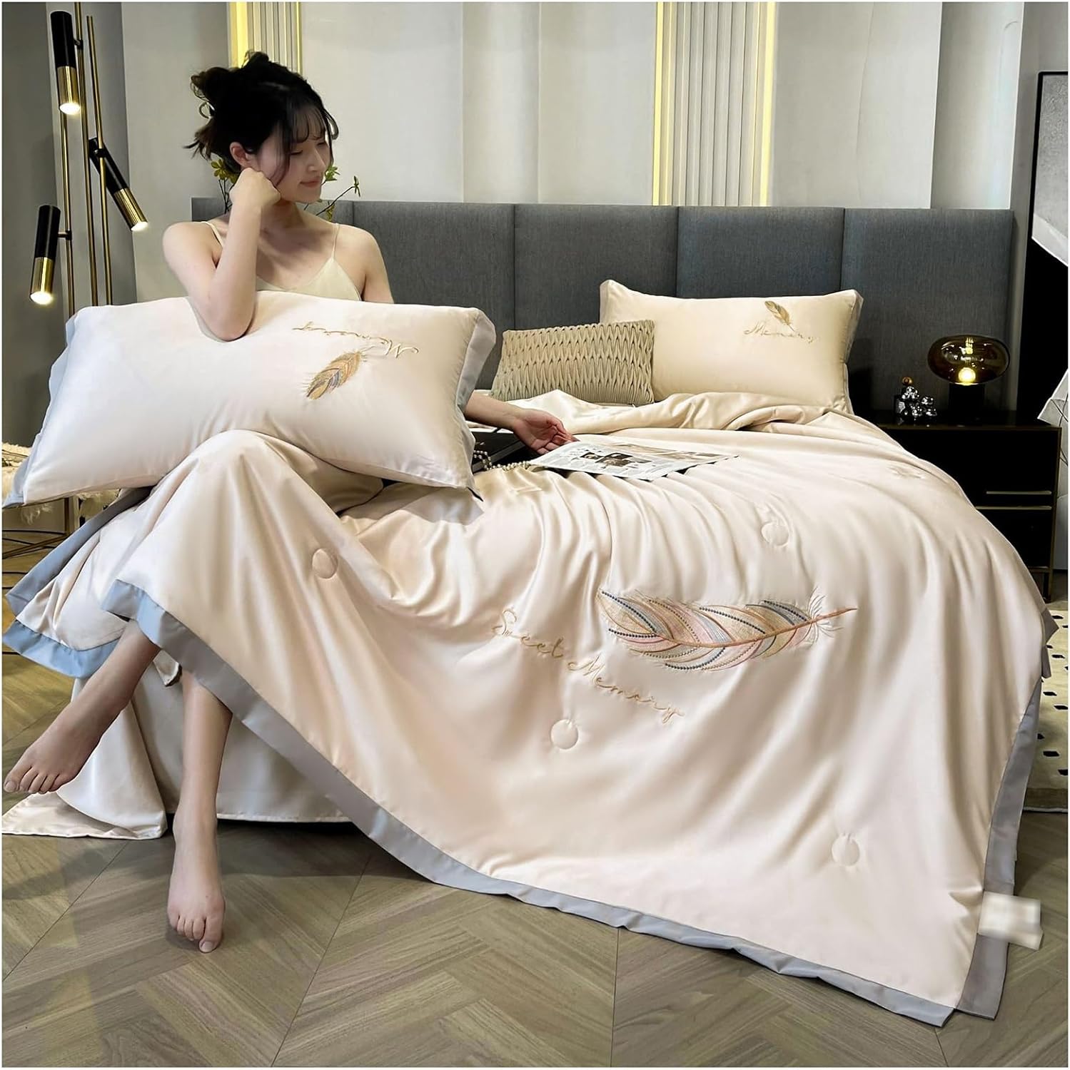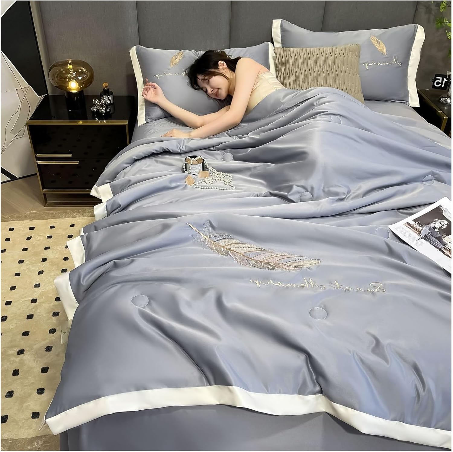 Simple Summer Ice Silk Quilt Comfortable Washable Quilt Air Conditioning Quilt Cover Simple Easy Clean Features: Cooling Feeling - With special cooling fabric that can absorb your body heat, this comforter keeps you cool and comfortable without sweating. SMOOTH FILLING Our ice silk duvet for sleeping is comfortable to touch, soft enough and breathable. MACHINE WASHABLE - The comforter is easy to clean and maintain, making it a great choice for busy households. Specification: Material: polyester fiber Printing and dyeing: reactive printing and embroidery Package includes: 1 x duvet. Note: 1. Due to different displays and lighting effects, the actual colour of the product may be slightly different from the colour shown in the picture. Thank you! 2. Due to manual measurement, please allow slight measurement deviation.