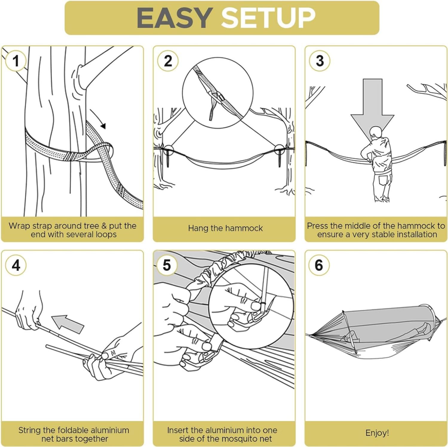 Your Personal Oasis in the WildImagine escaping the everyday hustle and finding your own slice of paradise in nature. With the Sunyear Hammock Shelter System, you can create a comfortable and secure haven wherever you go. This bundle combines our single trapezoid hammock with a specially designed rain fly, giving you the freedom to relax and recharge, protected from the elements. Whether you're deep in the forest or by a quiet lake, your personal retreat is just minutes away from being set up.A New Standard in Hammock CampingWe've rethought hammock design to deliver an experience of spaciousness and security. The unique trapezoid shape, supported by lightweight aviation aluminum poles, prevents the cocooning effect of traditional hammocks and creates a roomy, tent-like interior. The integrated no-see-um mesh keeps insects out while you enjoy the breeze and views. With a 500lb capacity and an anti-rollover design, you can rest with peace of mind, knowing you're safe and sound.Shelter from Sun and StormThe included rain fly is more than just a cover; it's your personal weather shield. Crafted from durable, PU 3000mm waterproof oxford rip-stop fabric, it's ready for anything from a light drizzle to a heavy downpour. What makes it special is the 14-inch door at the head, designed to provide extra protection from wind and driving rain. Its versatile 10x9.6ft size offers generous coverage for your hammock, ensuring you stay dry and comfortable no matter the forecast.Built for Adventure, Ready for AnythingThis complete kit is designed for the modern adventurer. Both the hammock and rain fly are constructed from high-quality, tear-resistant materials with reinforced stitching to ensure long-lasting durability. The entire system packs down into compact carry bags, making it easy to transport on any journey. The bundle includes all necessary accessories—tree straps, stakes,
