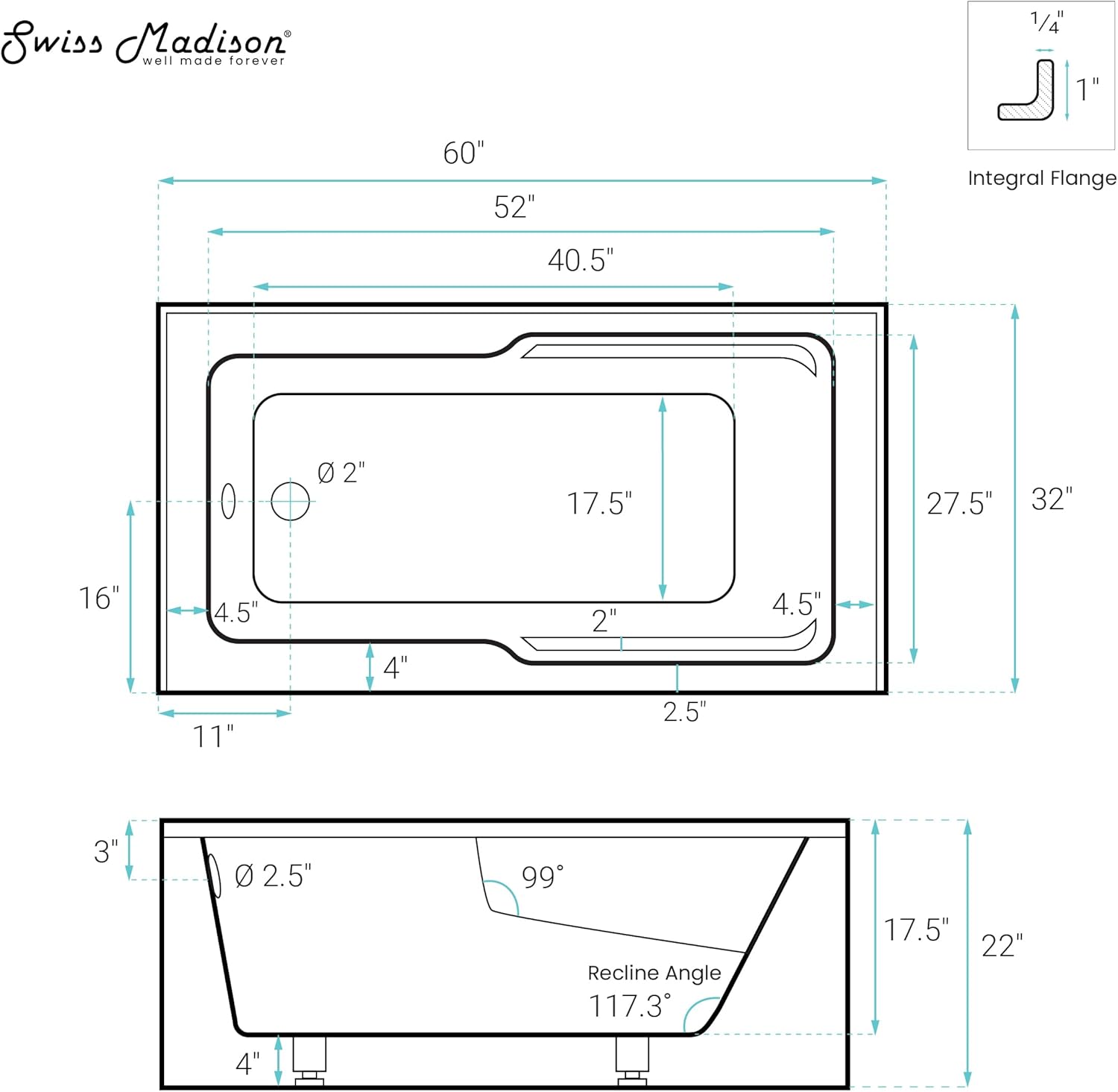 The Claire Alcove bathtub is a contemporary corner apron tub that can help save space in any bathroom. The built-in armrests are designed for comfortable soaks and its integral tile flanges help to prevent water leakage.