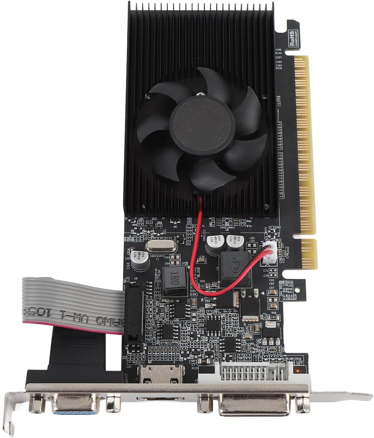 Specification: Item Type: Gaming Video Card Material: PCB Core Code and Process: GF119/40nm Shader Units: 48 Core Frequency/Video Memory Frequency: 810/600MHz Video Memory Capacity and Specs: 2GB/64bit/DDR3 Output Interfaces: DVI+VGA+HDMI Bus Interface: PCI Express 2.0 X16 Cooling Fan: Support How to Use: Ready to use Package List: 1 x Graphics Card