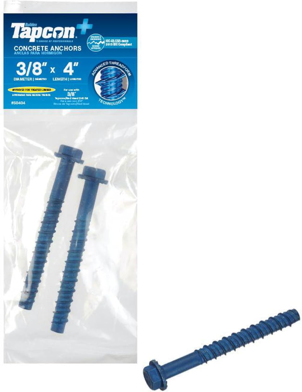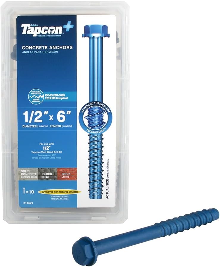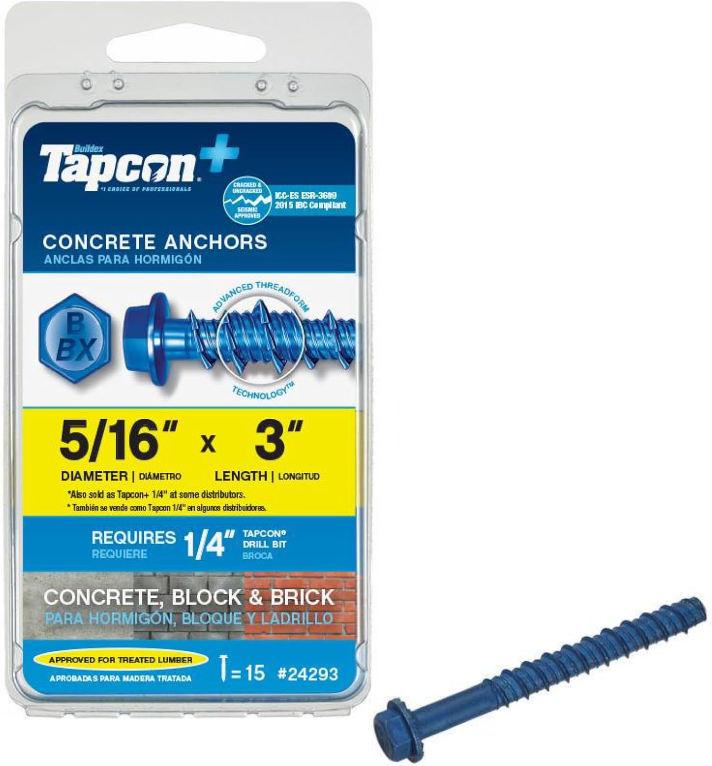 Get heavy-duty concrete fastening with Tapcon+ Concrete Anchors. Faster installation and stronger holding power than expansion anchors and wedge anchors. The threaded design anchors into concrete, block, and brick, delivering superior holding power in all conditions. ICC-ES certified (ESR-3699) for uncracked and cracked concrete in seismic applications. The blue Climaseal coating offers long-lasting corrosion resistance for harsh outdoor conditions, while the mechanically galvanized option is approved for exterior applications and pressure-treated lumber. Installation flexibility allows you to drive closer to edges and closer together, eliminating spacing limitations of expansion anchors. Ideal for sill plates, ledger boards, post-cap connectors, heavy equipment, industrial racking, and machinery mounting. Choose the anchor trusted by professionals for quality, strength, and performance.