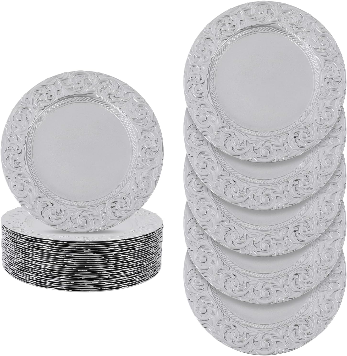 Description:With its unique design and elegant appearance, this charger plate adds elegance and delicacy to your table.It adopts White+Silver colors, which is very suitable for matching with various salad plates or bowls.Whether it's a family gathering, holiday celebration, or daily dining, this charger plate can be a highlight on your dining table, making every meal full of ceremony and happiness.Details:Rounded Corners: This design prevents you from scratching your skin during cleaning and use, improving the safety of use.Re-usable: This is not a disposable item; you can use it many times without losing the color or affecting the aesthetics easily, so it is eco-nomical.Sunken Bottom: It provides a proper place for placing salad bowls, soup bowls, and food plates to prevent accidental spills and protect your table.It can not only play the role of embellishing the tabletop but also keep the tabletop clean.Application:The product is suitable for birthday parties, weddings, banquets, baby showers, family gatherings, restaurants, hotels, traveling, camping, picnics, BBQ, daily life, Halloween, Thanksgiving, Christmas celebrations, or other events.Specification:Color: White+SilverMaterial: PlasticProcess: Spray PaintingStyle: European RetroAssembly Required: NoNumber of Pieces: 50Each Product Diameter: 33cm/13inPackage Size: 36*36*28cm/14.17*14.17*11.02inGross Weight: 9.5kg/20.94lbsNet Weight: 9.03kg/19.91lbsPackage Included:50* Plastic Charger PlatesNotes:1.This product is not recommended to be washed in a dishwasher.2.It is not recommended that the product come into direct contact with food.