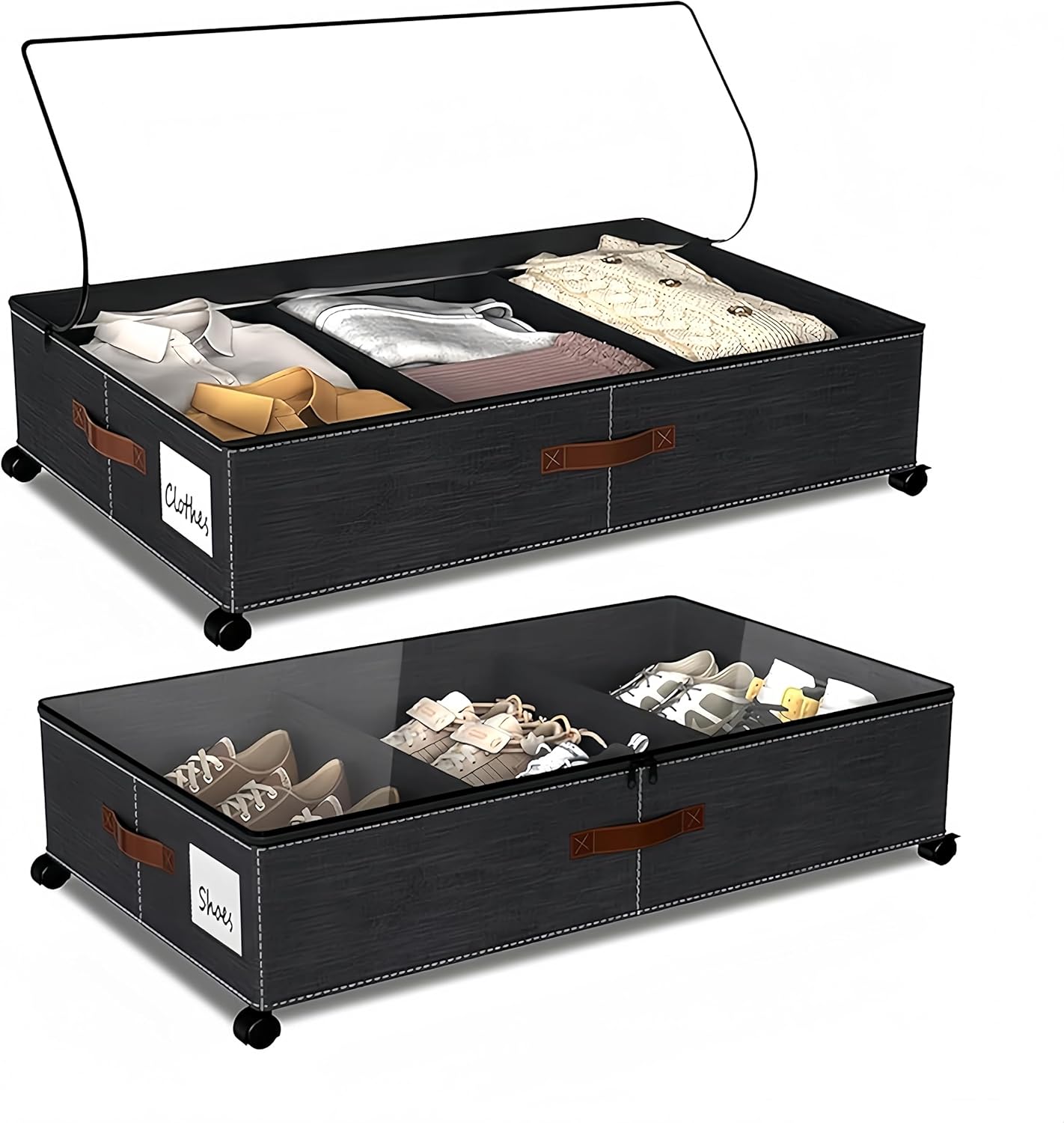 Tired of bedroom clutter taking over? Our Under Bed Storage Container with Wheels is the ultimate solution to transform chaos into order, ideal for stowing quilts, clothes, blankets, and more while maximizing unused space under beds, sofas, desks, or cabinets. 1.Space-Saving & Versatile Storage Designed to fit seamlessly under beds (requires under-bed height >7.0in), sofas, desks, or cabinets, this rolling storage bin turns wasted space into a tidy organizer. It’s perfect for holding 1 queen-size quilt, 3+ blankets, or up to 35 pieces of clothing—keeping your essentials accessible yet out of sight. 2.Transparent Window & Easy Access The clear PVC window lets you instantly identify contents without unzipping, while the smooth 2-way zipper ensures hassle-free opening. A sturdy PU leather handle and 360° lockable casters make pulling or repositioning the bin a breeze—even on carpet. 3.Durable Build for Longevity Crafted from tough Oxford fabric (no tearing like flimsy non-woven alternatives) and supported by a robust metal frame, this storage box holds up to 66 lbs. It’s built to withstand daily use, whether storing seasonal bedding or everyday wardrobe staples. Declutter your space effortlessly. Upgrade to our Under Bed Rolling Storage Organizer today and enjoy a neater, more organized home!