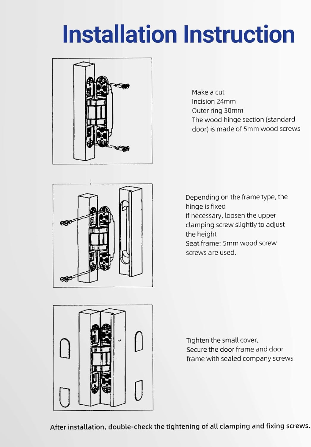 | Included Components | 2 invisible door hinges, 1 detailed instruction manual, a set of three - dimensional adjustment tools, 2 gap thickness gaskets for under the door, and the corresponding product - specific drilling bits |