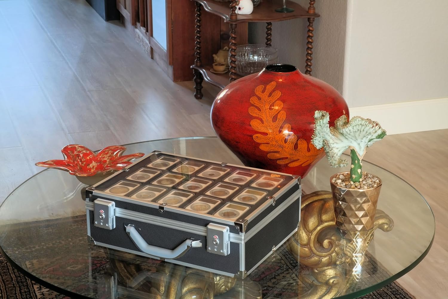 This stylish and dramatic aluminum box with a display top for 15 coins and an overall capacity of 115, holds certified coins in standard size holders from any of the major grading services or certified style holders from brands such as Ursae Minoris or Lighthouse. Built with sturdy materials, this rugged box is crafted with attractive exterior fittings and has foam inserts for easier handling of the coin holders. Ursae Minoris Elite aluminum slab boxes are perfect for storage and when traveling.