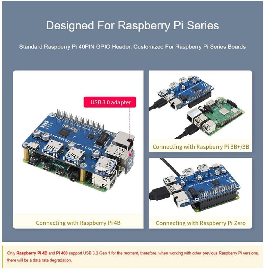 Features at a glance 3x USB 3.2 Gen1 ports, compatible with USB 3.0 / 2.0 /1.1 1x Gigabit Ethernet port, 1000M/100M/10M compatible Onboard external USB-C 5V DC power port, ensures more stable power supply 1x power indicator and 3x USB port indicators, easy to check the operating status Driver-free, plug and play, compatible with OS including Windows, mac OS, Linux and Android Purpose-made for Raspberry Pi 4, compatible with other Raspberry Pi version as well Comes with development resources and manual USB 3.2 Gen 1 OR USB 3.0 they're totally equivalent in fact, indicating the transition of technical naming specification the word USB 3.0 on this page exactly means USB 3.2 Gen 1 Data rate:5 Gbps Used name:USB 3.0 / USB 3.1 Gen 1 Current name:USB 3.2 Gen 1