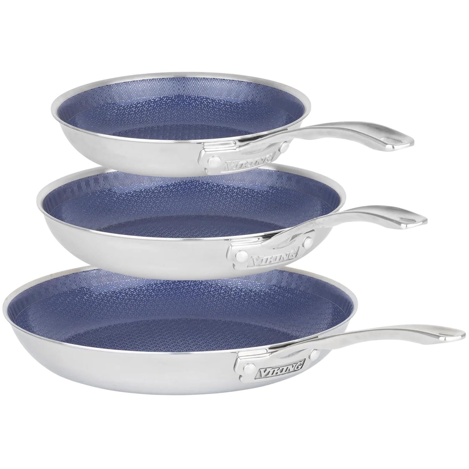 Viking's Hybrid Plus 3-Ply Ceramic Nonstick Cookware Fry Pans are made without PFAS for healthy, non-toxic cooking. Combining traditional stainless-steel with nonstick, these frying pans are compatible with all stovetops, including induction, and are oven safe up to 500 degrees. Viking's nonstick fry pans are versatile for any kitchen setup, allowing you to use from stovetop to oven, expanding your culinary possibilities. For optimal results, cook on low to medium heat, and avoid aersol nonstick sprays to extend the life of the nonstick coating.Viking's Hybrid Plus cookware is coated with an advanced double-layer ceramic nonstick coating made without PFAS, allowing you to enjoy healthier cooking and effortless food release, making it easier to prepare dishes while simplifying cleanup. The 3-ply clad construction achieves consistent, professional quality heat transfer; the stainless steel fry pans combine an exterior and interior steel layer with an aluminum core, helping conduct the heat evenly through both the bottom and walls of the pan. Perfect for searing, sauteing, and braising while still delivering easy cleanup. The innovative design of the cooking surface features a raised stainless steel pattern that protects the nonstick coating from scratches and damage; making this pan suitable for use with metal utensils and ensuring long lasting performance and a pristine cooking surface. Frying pan is dishwasher safe; handwashing is recommended to extend the life of the nonstick performance Riveted for balance and design, the signature Viking handle provides a comfortable, secure grip for safe handling. The handle is equipped with a heat break to help them stay cool during use and features a finger guide for easy lifting and control.