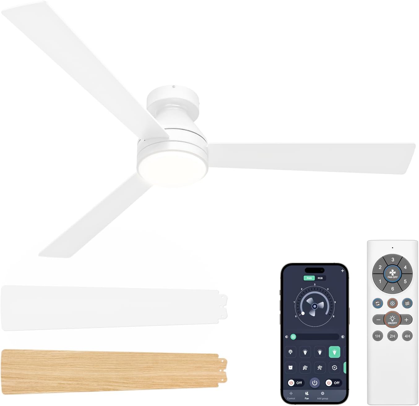 | Special Features | 3CCT Dimmable ceiling fans with lights, 6 wind speed and reversible motor, white ceiling fan light with dual memory function and 1/2H Timer Off, with double-side for modern and farmhouse style |
