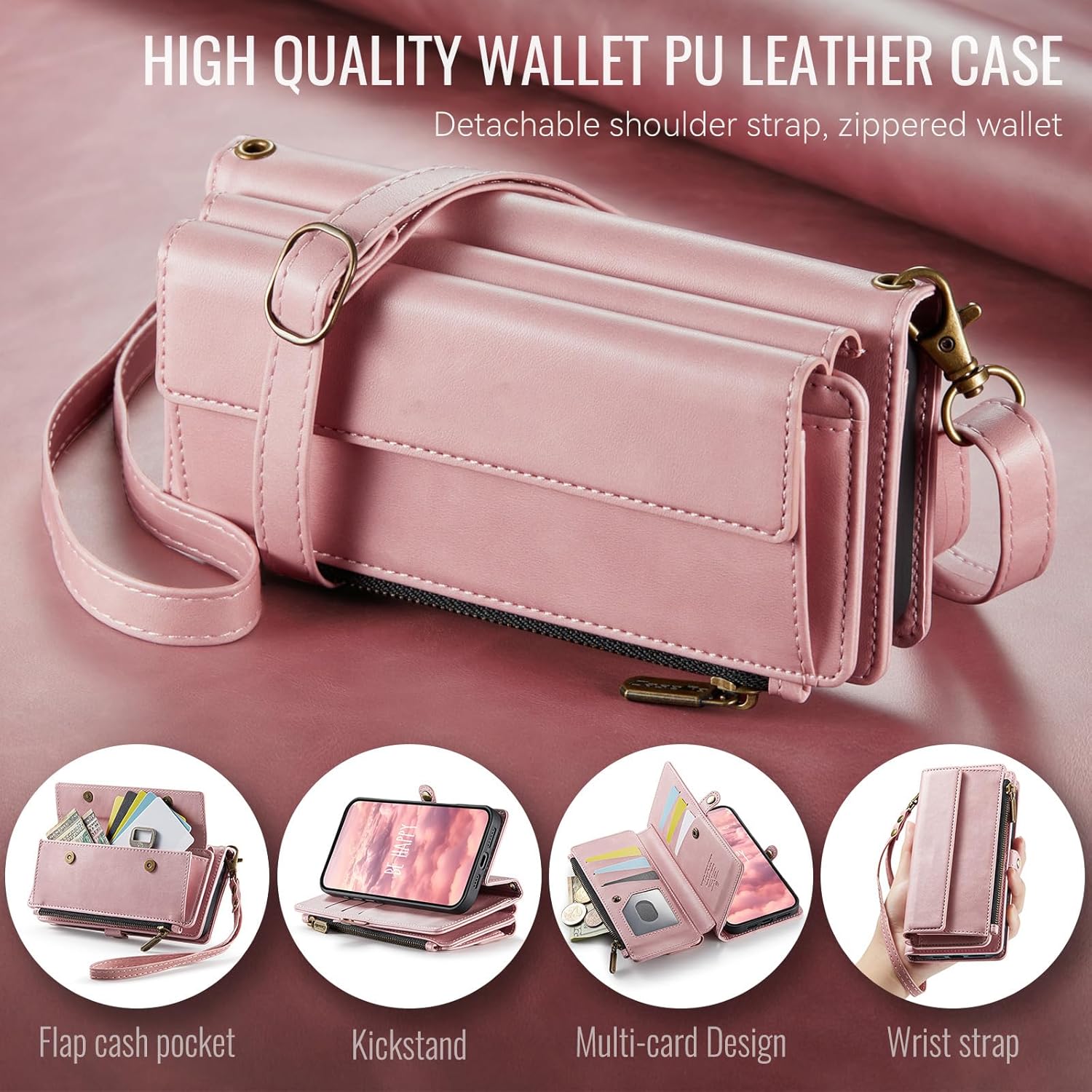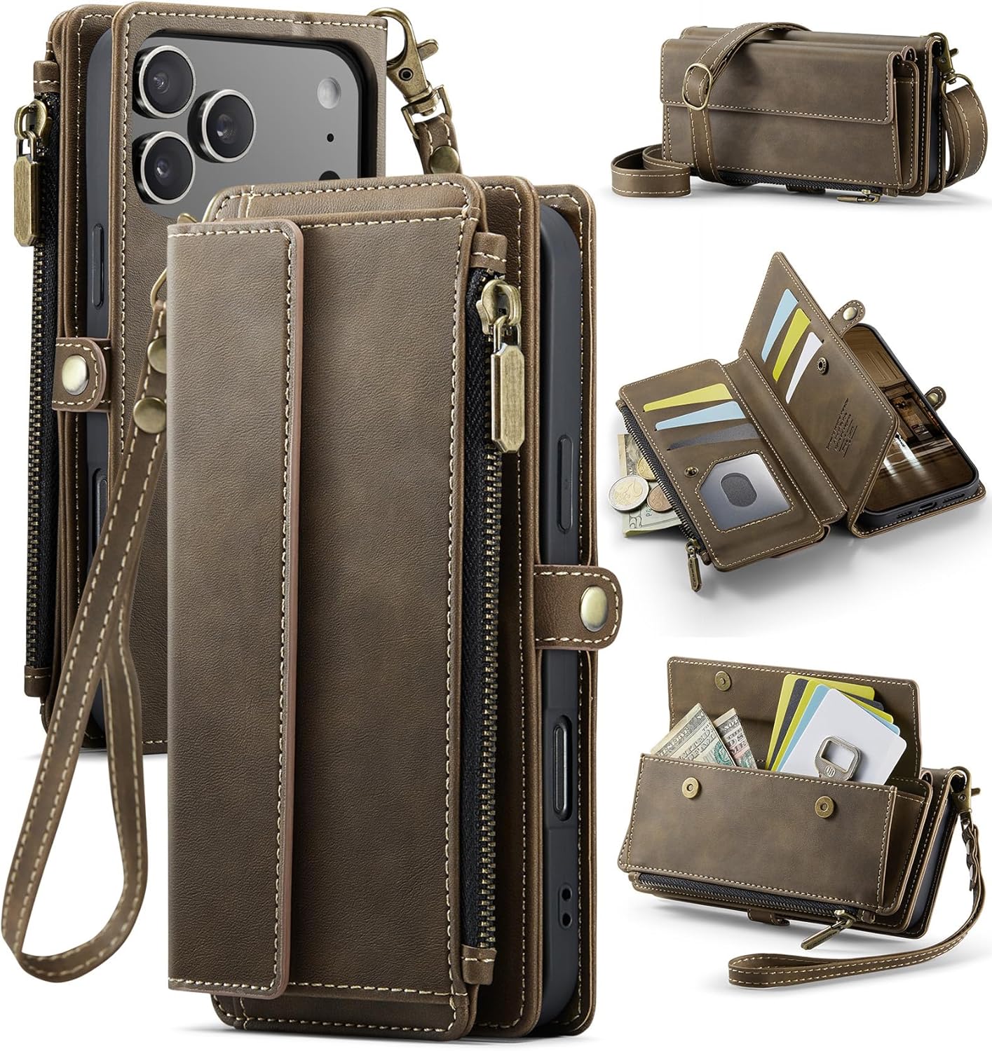 CHOOSE EXCELLENCE, CHOOSE INNOVATION, CHOOSE US-- [Multi-Functional Wallet Case] [RFID Blocking Technology]-- Stylish, Protective & Conveniently Designed【WE ALWAYS MAKE PHONE CASES WITH SINCERITY】-- LARGE CAPACITY STORAGE – 9 card slots, 1 cash slot, 1 zipper coin pocket, and 1 flap pocket keep your cards, bills, and coins secure. -- RFID BLOCKING TECHNOLOGY – Built-in protective material prevents electronic pickpocketing and protects sensitive card information. -- DETACHABLE STRAPS – Adjustable shoulder strap and wrist strap allow crossbody, handbag, or wristlet use for flexible carrying options. -- KICKSTAND & WIRELESS CHARGING – 360° rotating stand for hands-free use and compatibility with standard wireless charging pads. -- DURABLE & STYLISH – Premium PU leather with precise craftsmanship ensures long-lasting durability and elegant appearance. A QUALITY PRODUCT WITHIN YOUR REACH!------- with Secure, Stylish, and Functional Design[VISUAL AND CRAFTSMANSHIP ARE PERFECTLY COMBINED]Multi-Card & Cash Slots RFID Protection Layer Shockproof Drop Resistance PACKAGE CONTENTS :1 x Wallet Phone Case 1 x Crossbody Strap 1 x Wrist Strap