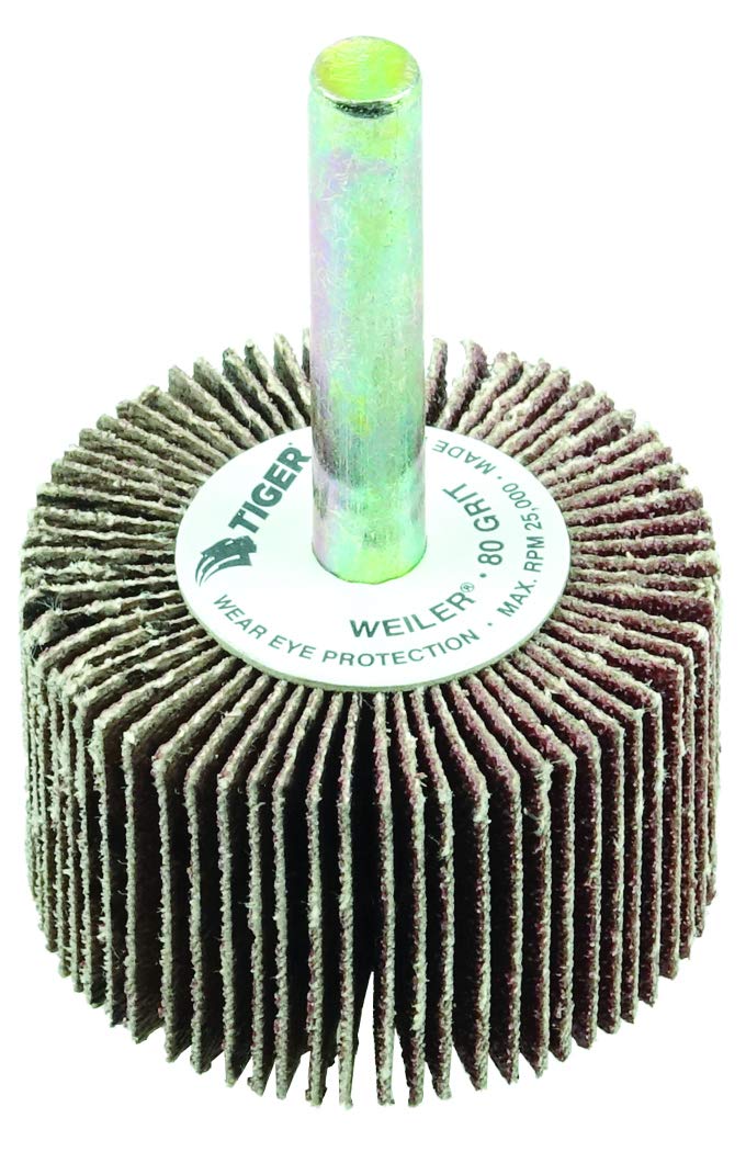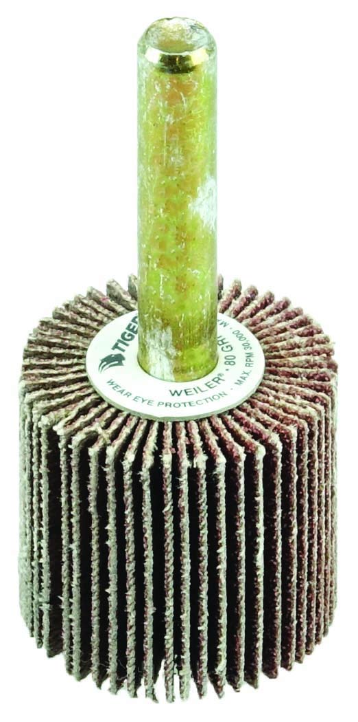 Weiler Tiger premium aluminum oxide 3 inch coated abrasive flap wheels provide fast cutting and long life on steel and other metals. The 1/4 inch stem allows for easy mounting on a die grinder or right angle die grinder. The flap wheel can be dressed to conform to an application part. A solid hub construction increases balance and reduced vibration in applications such as tube ID cleaning, thread cleaning and deburring.