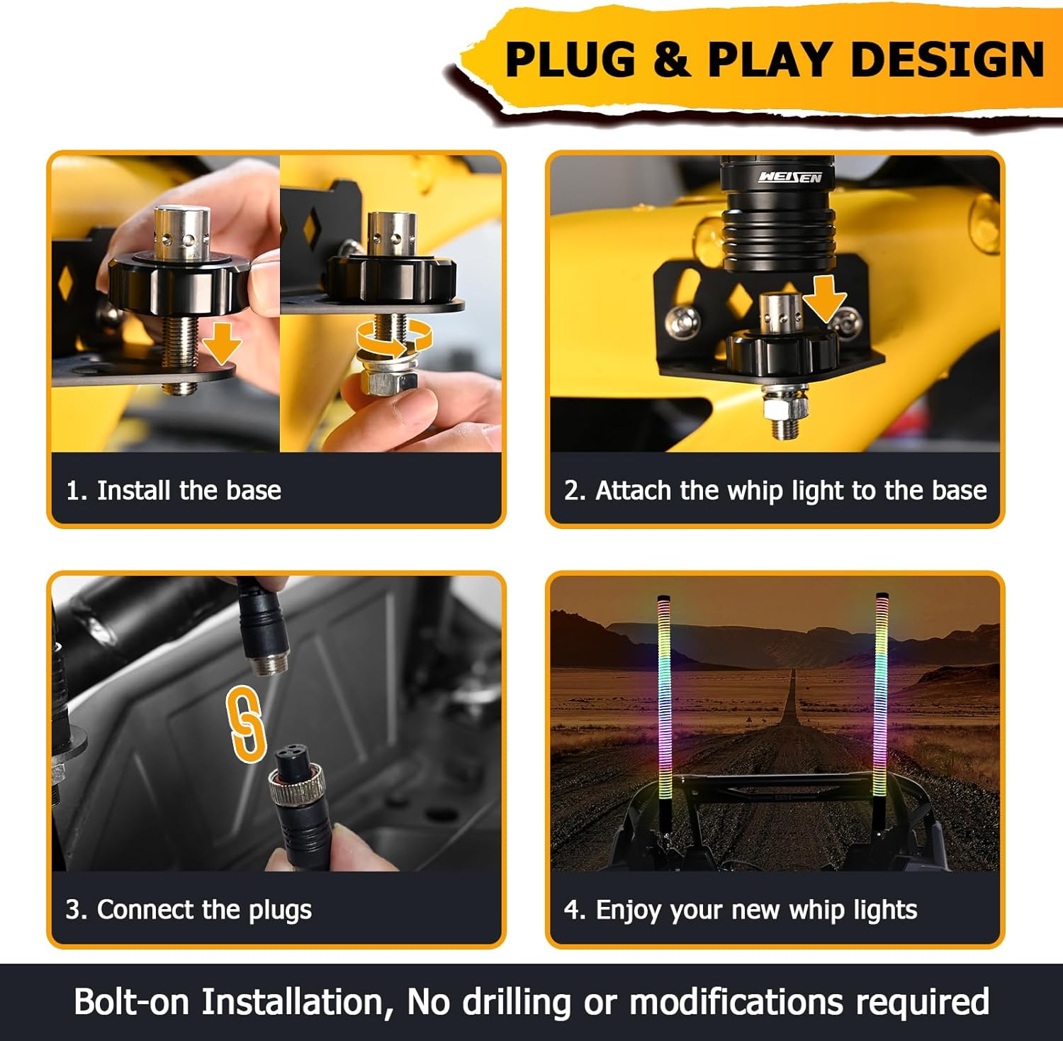 "Fitment: Fit Rancher TRX420 (Solid Axle ONLY) - (FA*FE*FM*TE*TM) 2014 Fit Rancher TRX420 -(FA*FE*FM*TE*TM) 2015-2024 Fit Foreman TRX500 -(FM1E*FE1E*FM2E*FE2E*FM*FPM*FPE) 2014-2019 Fit Foreman TRX520 (All Models) 2020-2024 Fit Rubicon TRX500 4x4 (All Models) 2015-2019 Fit Rubicon TRX520 (All Models) 2020-2024 Specification: Item: 3FT Fat COB Whip Light(2pcs) Light Source: 9216pcs 0603 LEDs Material: EVA transparent heat-shrinkable tube and aluminum alloy base Waterproof Rate: IP67 Color: More than 16 million Light Modes: More than 300 Scene Modes: 28 Brightness Adjustment: Yes Speed Adjustment: Yes DIY Function: Yes Timing Function: Yes Music Mode: Yes Mic Mode: Yes SOS Mode: Yes Dynamic Scan Start-up Effect: Yes Signal Light: Red brake light & yellow turn signal & white reverse light Item: Winch Mounting Bracket Material: Heavy-Duty Steel Process: Black Powder Coated Winch Mounting Pattern:①Standard 4-Hole 3""x4 7/8"" (76mm x 124mm), ②2-Hole 3.10""(78mm )/3""(76mm) Fairlead Mounting Pattern: 4 7/8"" (124mm) Package Included: 2 x 2FT Fat COB Whips 2 x Flags 2 x Customized Flags 2 x Dust Caps 2 x Extension Wiring Harnesses 1 x Control Box 1 x Installation Instructions.1x Winch Mounting Bracket"