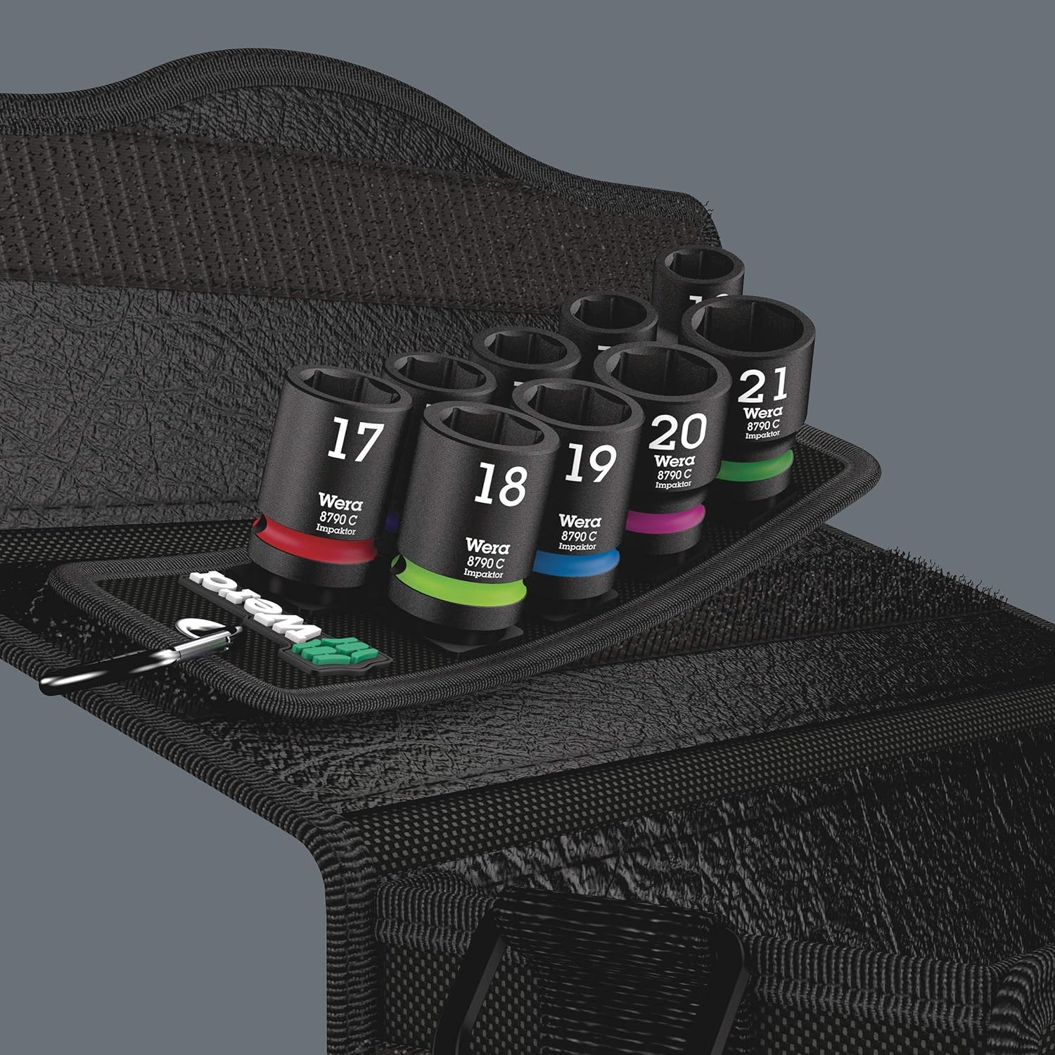 Robust textile belt in the typical Wera design with nine Impaktor socket wrench plug-ins for missions in confined spaces. A smooth Twist to Unlock mechanism ensures a secure fit and simple removal of the sockets. Including snap hook for attachment on belt loops or bags. With fleece backing and hook and loop fastener strips for easy attachment e. g. on wall, shelf, workshop trolley and Wera 2go tool transport system. Impaktor sockets for use with electric or pneumatic powered impact wrenches with 12. 5mm = ½“ drive. Impaktor technology ensures above-average service life, even under extreme conditions. With Take it easy tool finder with colour coding by size - for easy and fast location of the required tool. With hexagonal profile and grooved socket. The hexagon profile allows the transmission of high forces and puts less strain on the edges of bolts or screw heads than a double hexagon profile. For external hexagonal bolts and sockets. Included components: 1x Belt C Impaktor 1 socket set, 1/2" drive, 10 pieces; 9x 8790 C Impaktor socket with 1/2" drive: 13. 0x38. 0, 14. 0x38. 0, 15. 0x38. 0, 16. 0x38. 0, 17. 0x38. 0, 18. 0x38. 0, 19. 0x38. 0, 20. 0x38. 0, 21. 0x38. 0; 1x Socket rail C (textile belt), 6 location, unloaded, 71 x 210 mm; 1x Hook and Loop Fastener Strips 30, 200 x 30 mm.